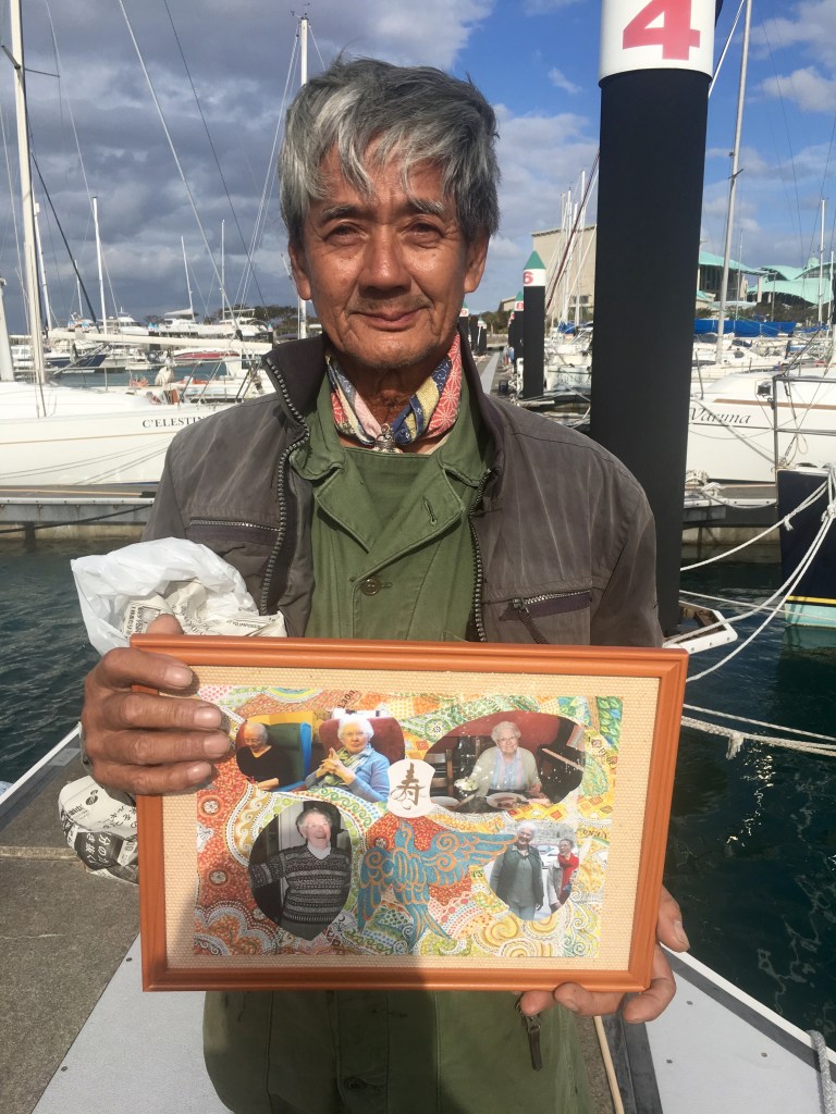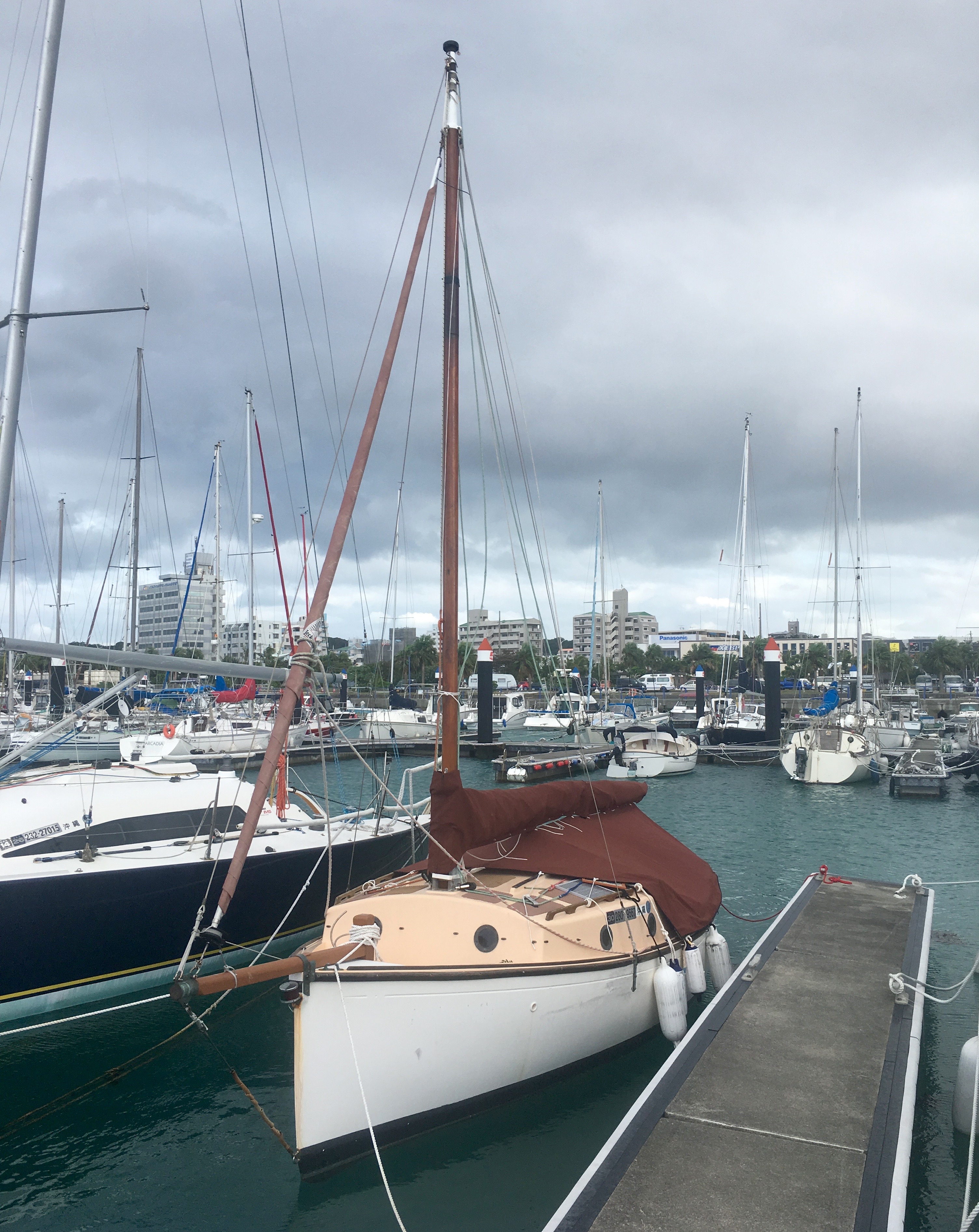 So, I leave Okinawa for several months on Wednesday morning. I put on all covers, sling fenders, check mooring lines and generally tidy up. She is in good shape and I have no worries about leaving her. Also Kiyuna san will keep his eyes on her. ” I have more eyes than teeth.” he asserts.