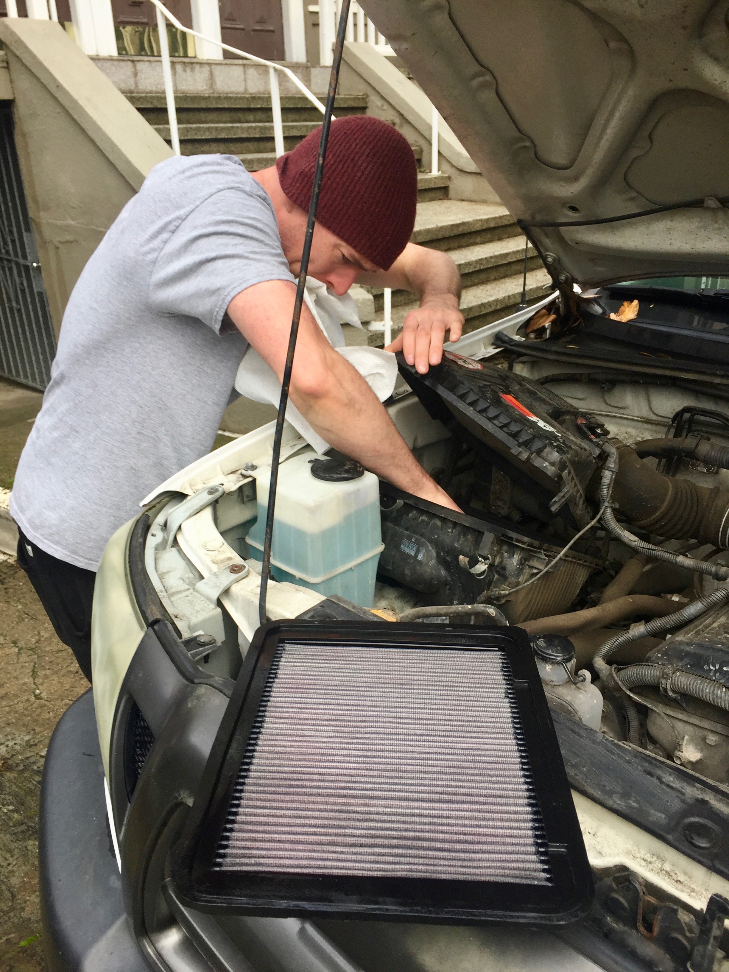 I check all the fluids and James cleans out the air filter.