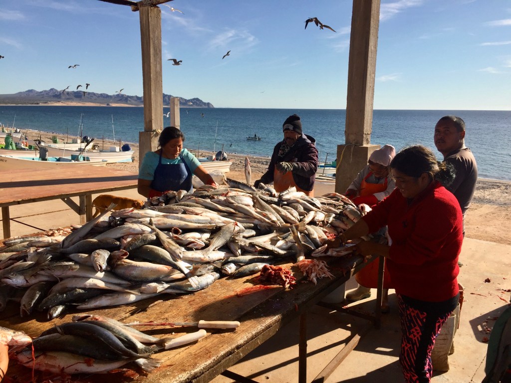 There are a lot of fisher folk chopping up fish.