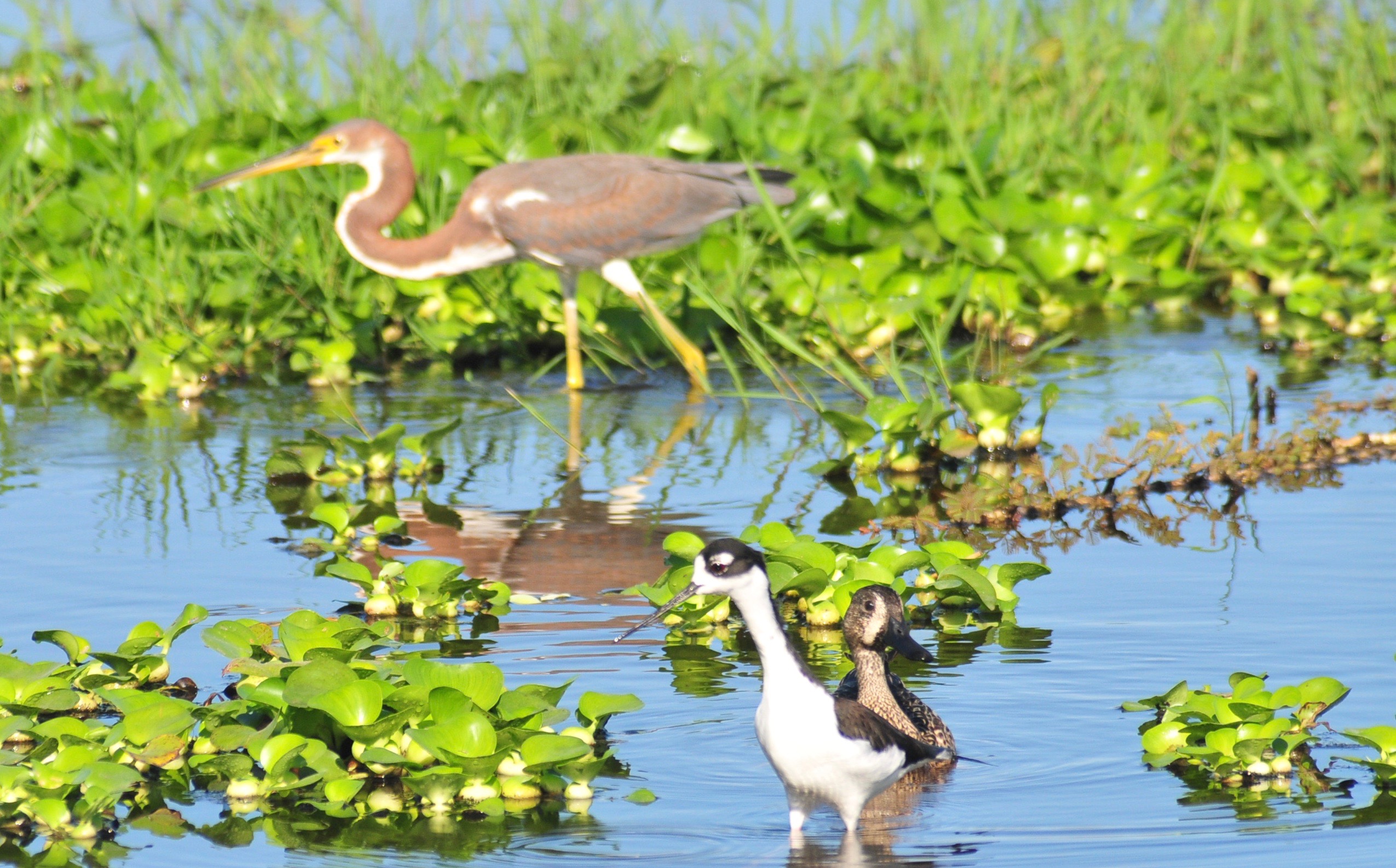 Black necked Stilt, Blue winged Teal, Tri colored Heron