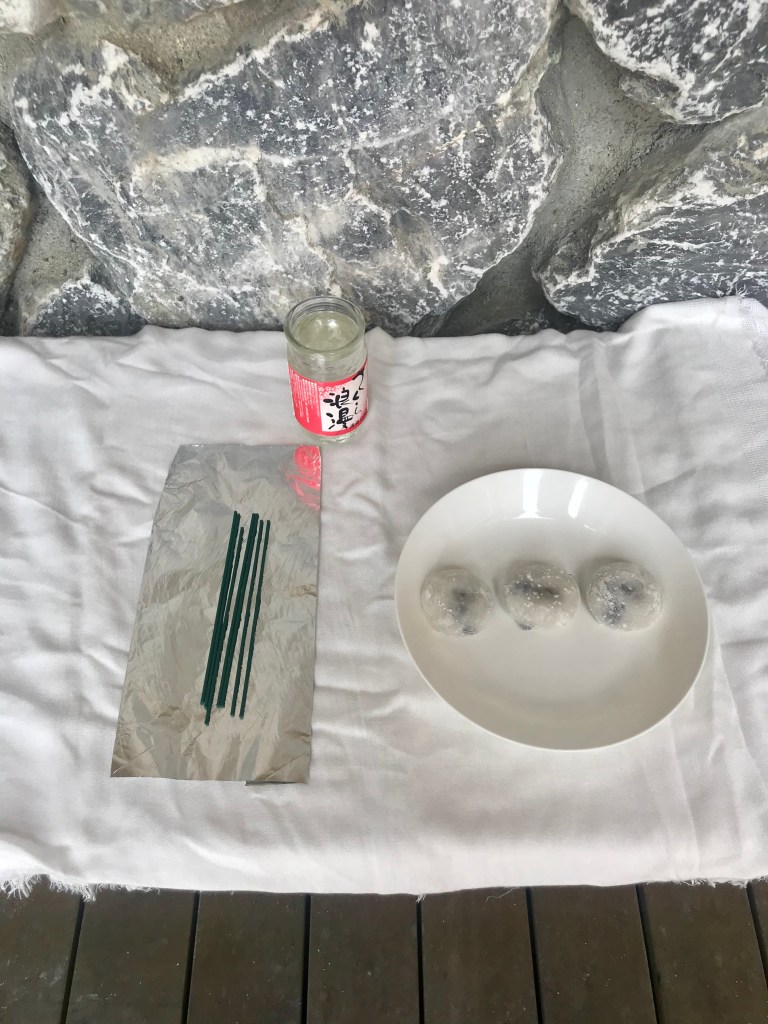 I had to place the rice sweets in a location designated by Naoko and also sprinkle the sake. The incense I had to take with me.