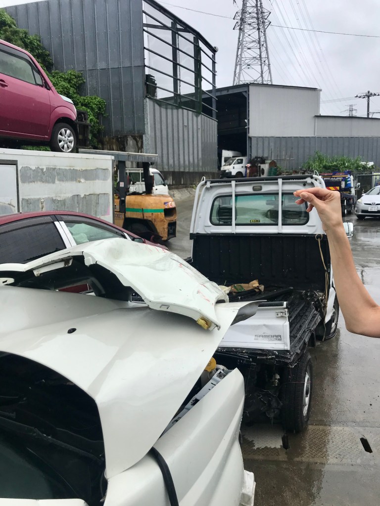 Naoko then prepared packages of salt, one she kept, one I keep, one stays in my rental car. We then drove down to the wrecker’s yard where she sprinkled salt on what is left of the car.
