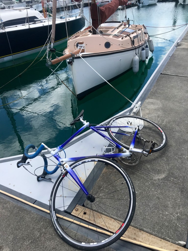 Having established my credentials in Ginowan, I determine to test the reality of the bike to boat, sail, bike back home daydream. Off I go and discover that I can bike along a sort of harbor wall pathway almost all the way to the marina. There is one huge and at the moment empty-looking hotel that blocks the last bit, but once circumvented, there is another nice seaside ride to the boat. However, ominously it is already 33 degrees at 09:00. The trip takes 15 minutes at a very leisurely pace.