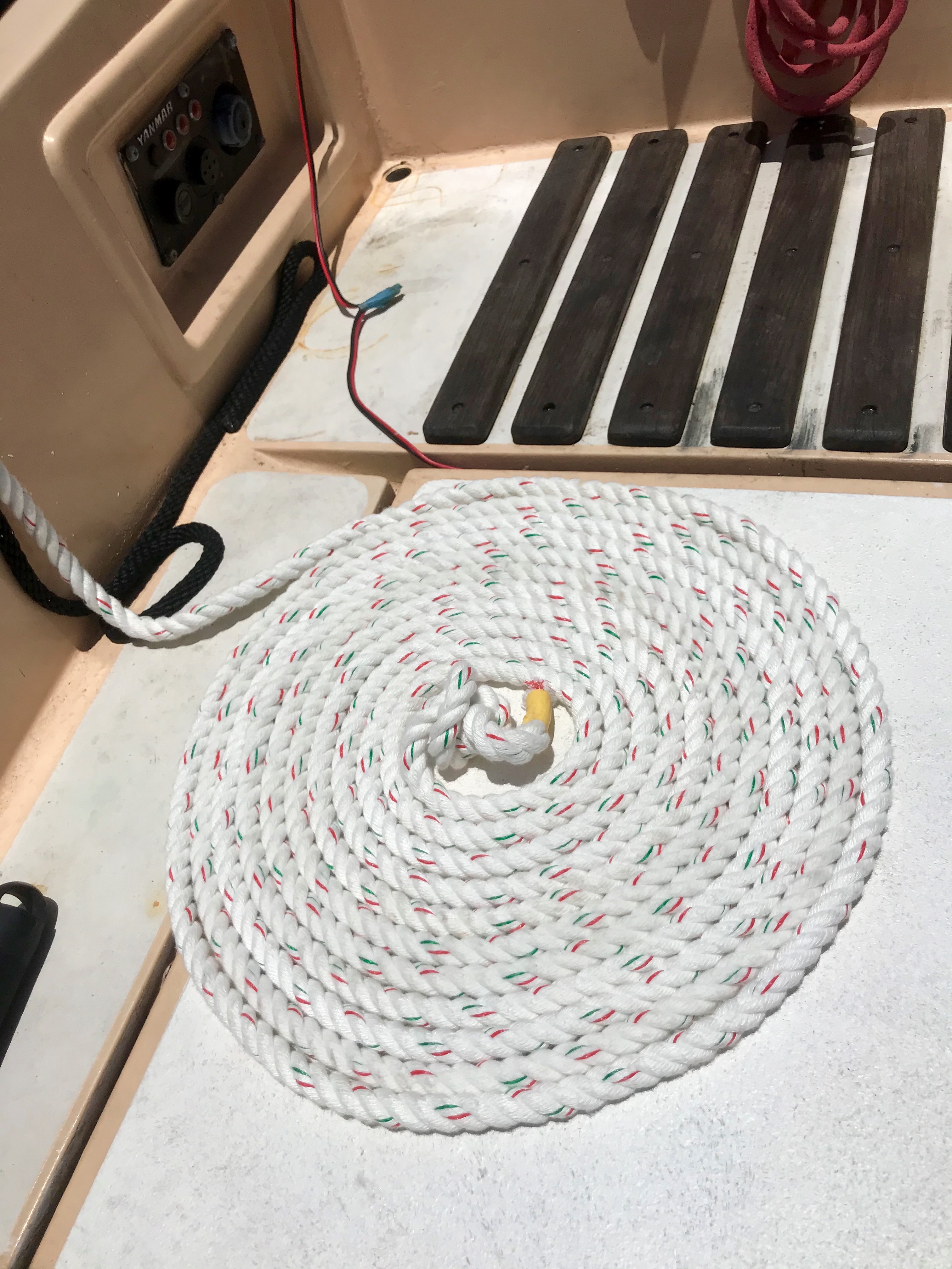 I replace the jib sheet with new but cheap rope, which will certainly do the job. The incumbent sheet must be 25 years old.