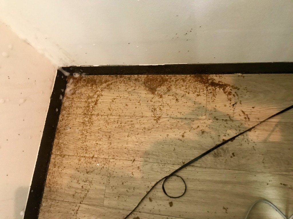 The apartment throngs with fruit flies. This not unusual in Okinawa where they flourish on any vegetable matter and in the drains. Removing the trash can, I notice strange activity behind the fridge. It is a squirming mass of fruit fly larvae – yuck!