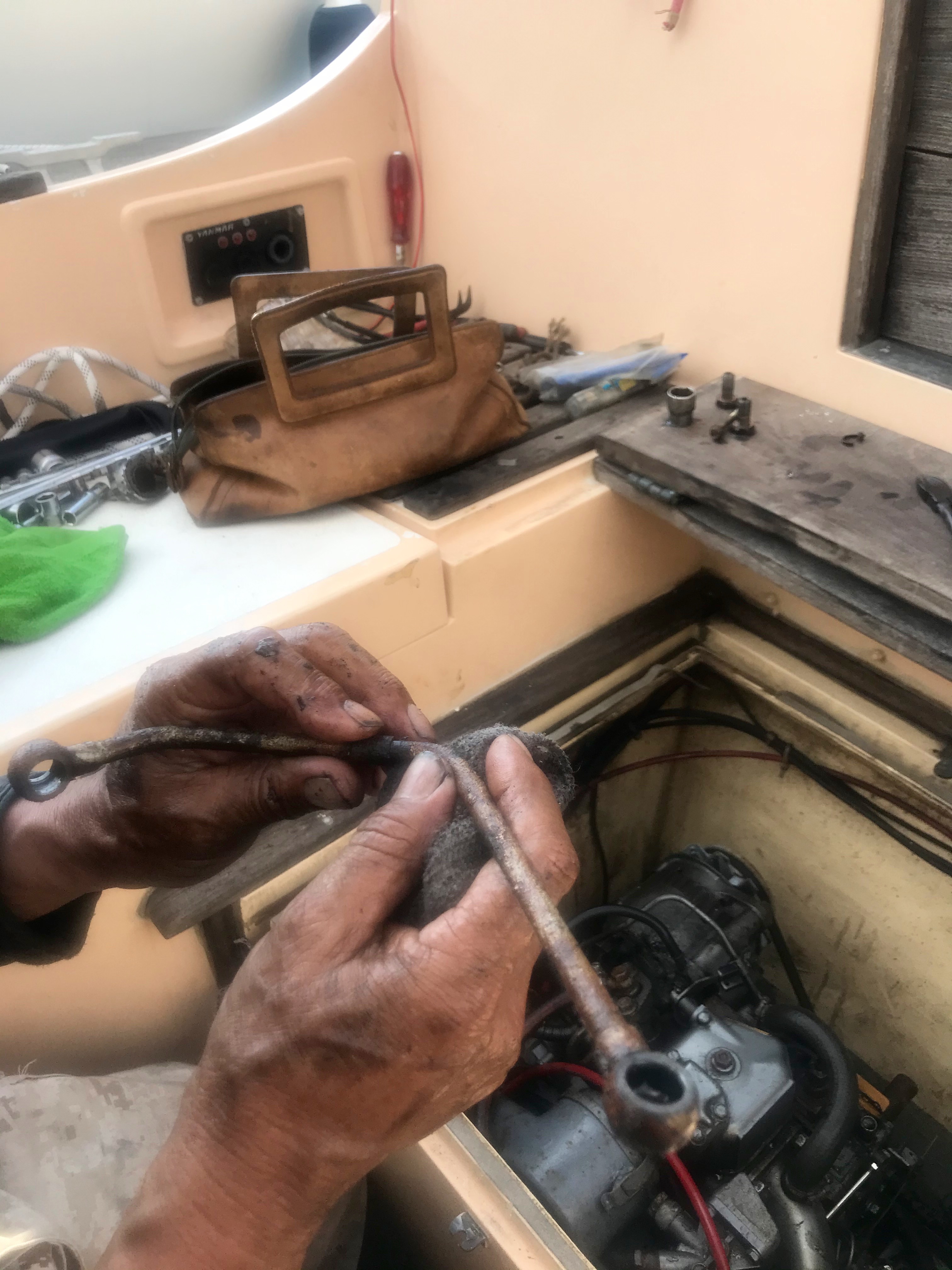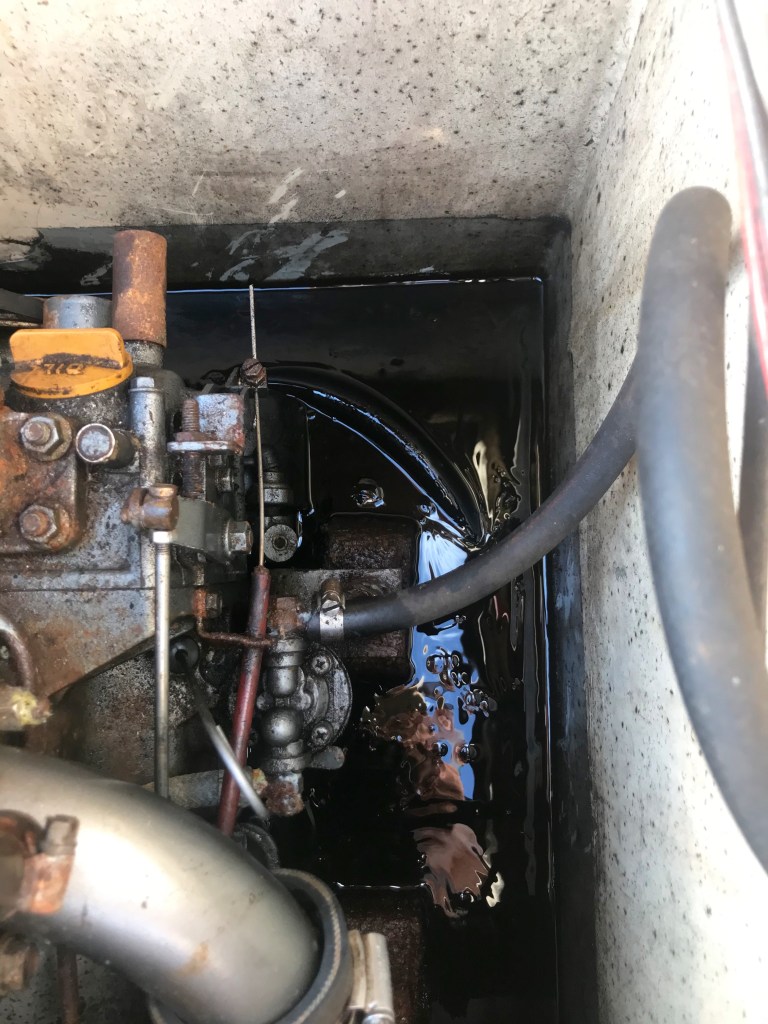 This not a complete surprise as I have noticed traces of oil in the the last few strokes of the mighty Gulper’ s pumping out the bilge exercise. I knew that something bad was going to happen. Recognized weaknesses of the legendary Yanmar 1GM10 are the oil lines that run under the engine. They corrode and split.