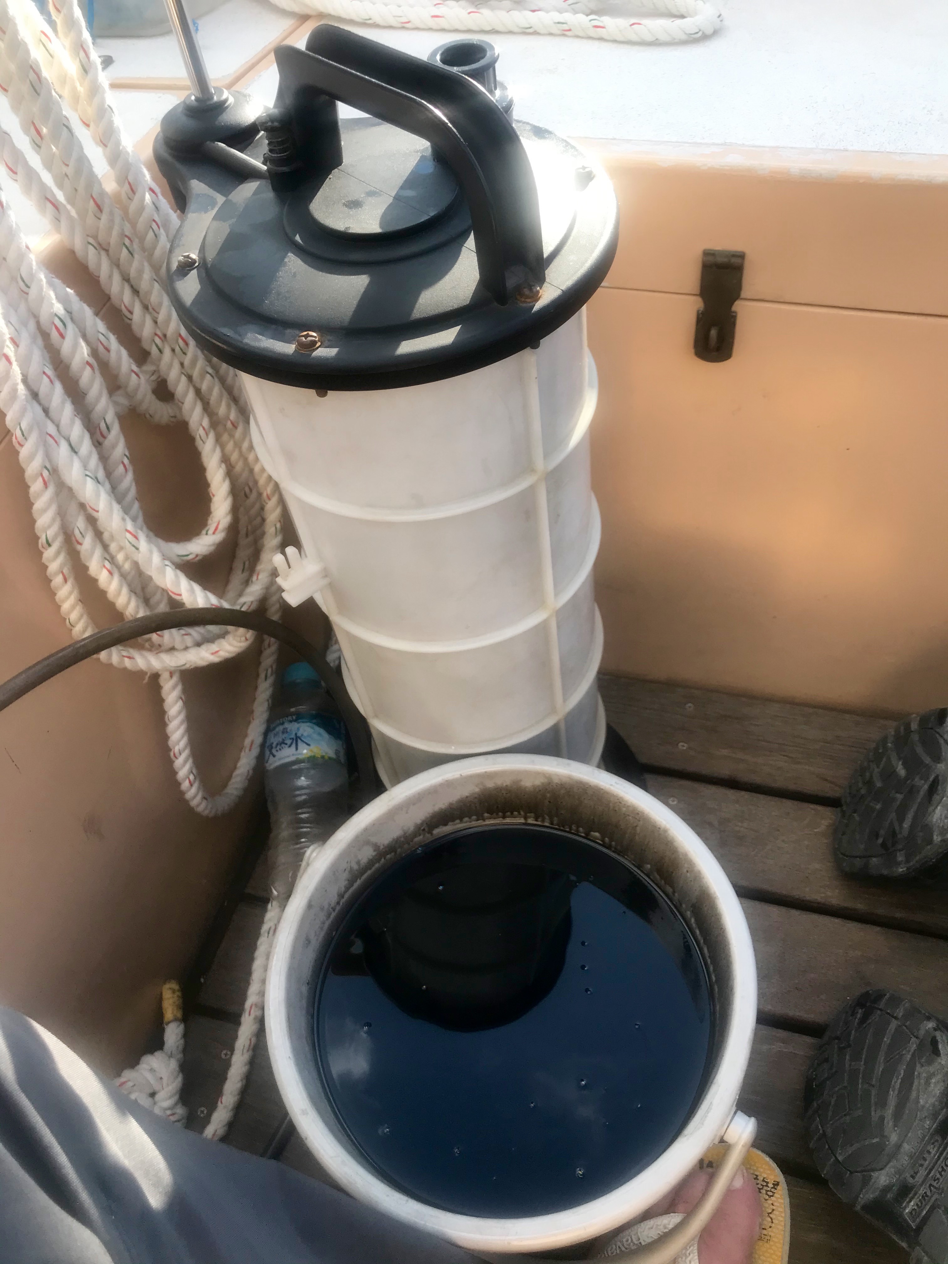 Before we or more accurately, he, can fit the new oil line, we have to pump out all the oil and water in the bilge to gain access to the lines. We can’t just pump it out into the marina. Kiyuna san brings over his vacuum pump a great device that sucks all the liquids into, er, itself.