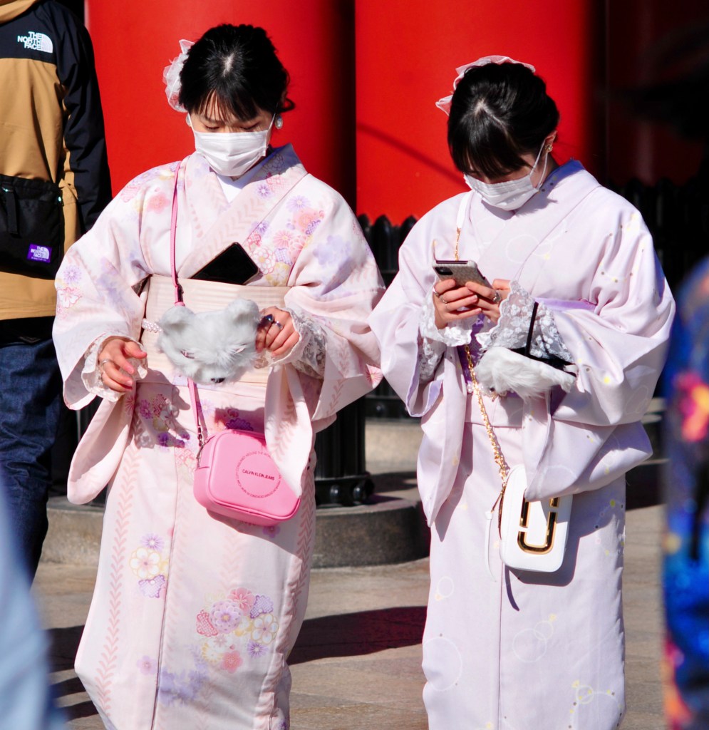 There are many beautiful young women wearing kimonos. Maybe it is a Saturday tradition to come to Asakusa to be photographed.