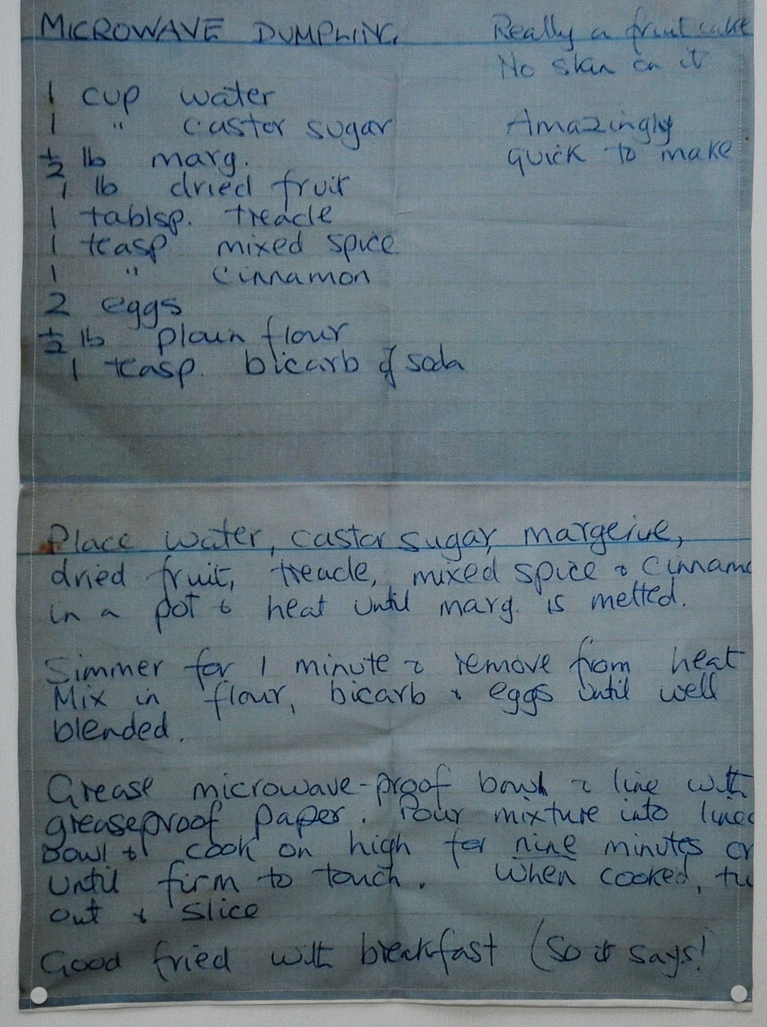 What joy to get a wonderful Xmas present from my sister Rosy. It is a recipe for dumpling written by my Mother, which somehow Rosy had printed onto a tea towel. It is now on my bedroom wall.