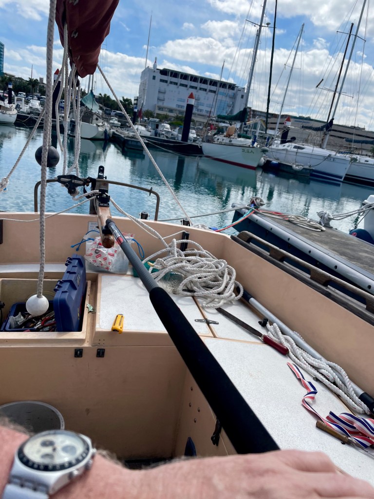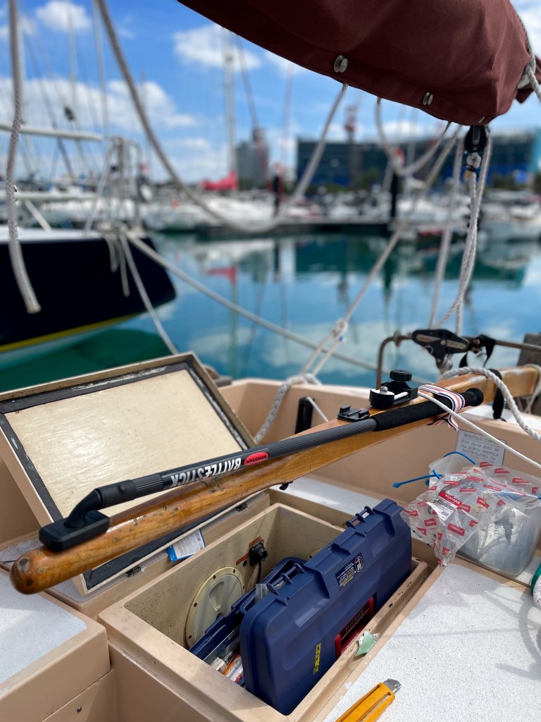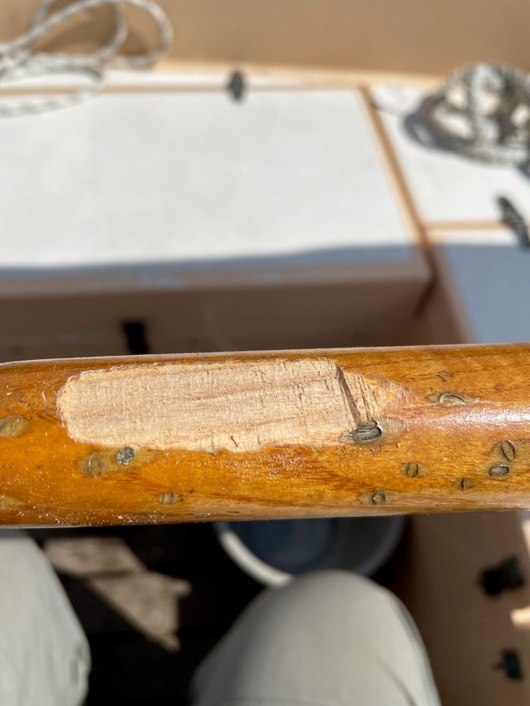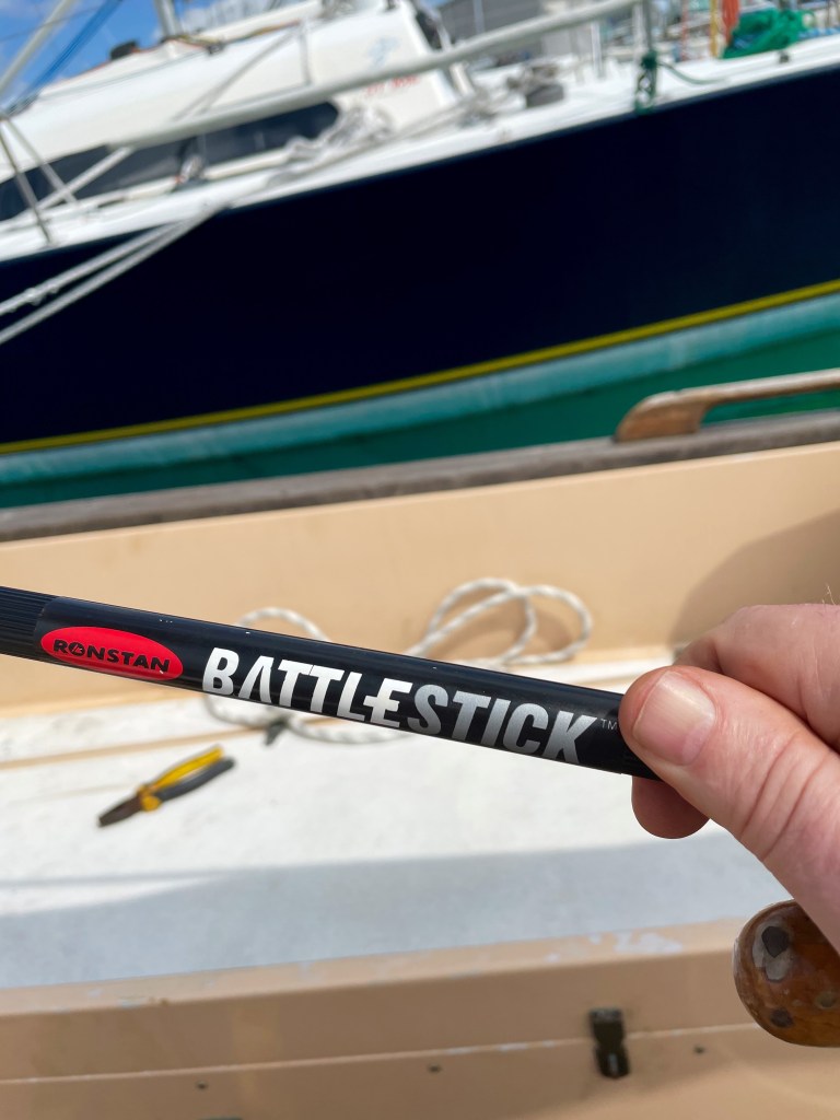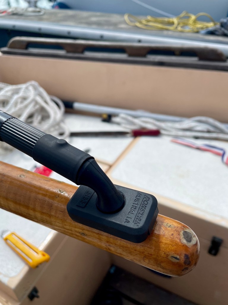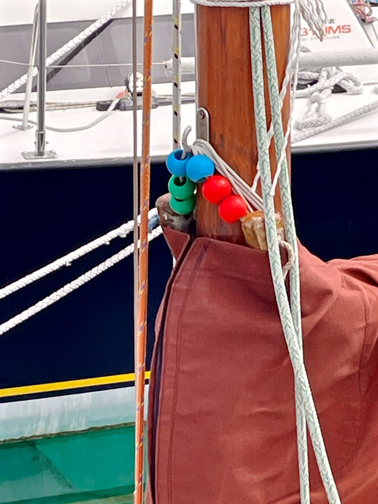There are little balls that prevent the gaff throat from swinging away from the mast and also make it easier for the throat to slide up the mast when raising the mainsail. Anyway, I replaced the scruffy old ones with pretty colored ones.