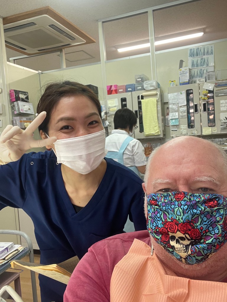 Lots of anaesthetic dispensed from a device that plays calming music at the same time. Mori sensei attacks with the pliers and wiggles the tooth from side to side before easing it out. I take many photos but they are too gruesome to post. So much blood. He then removes lots of diseased bone tissue and whacks in some stitches. Such fun.