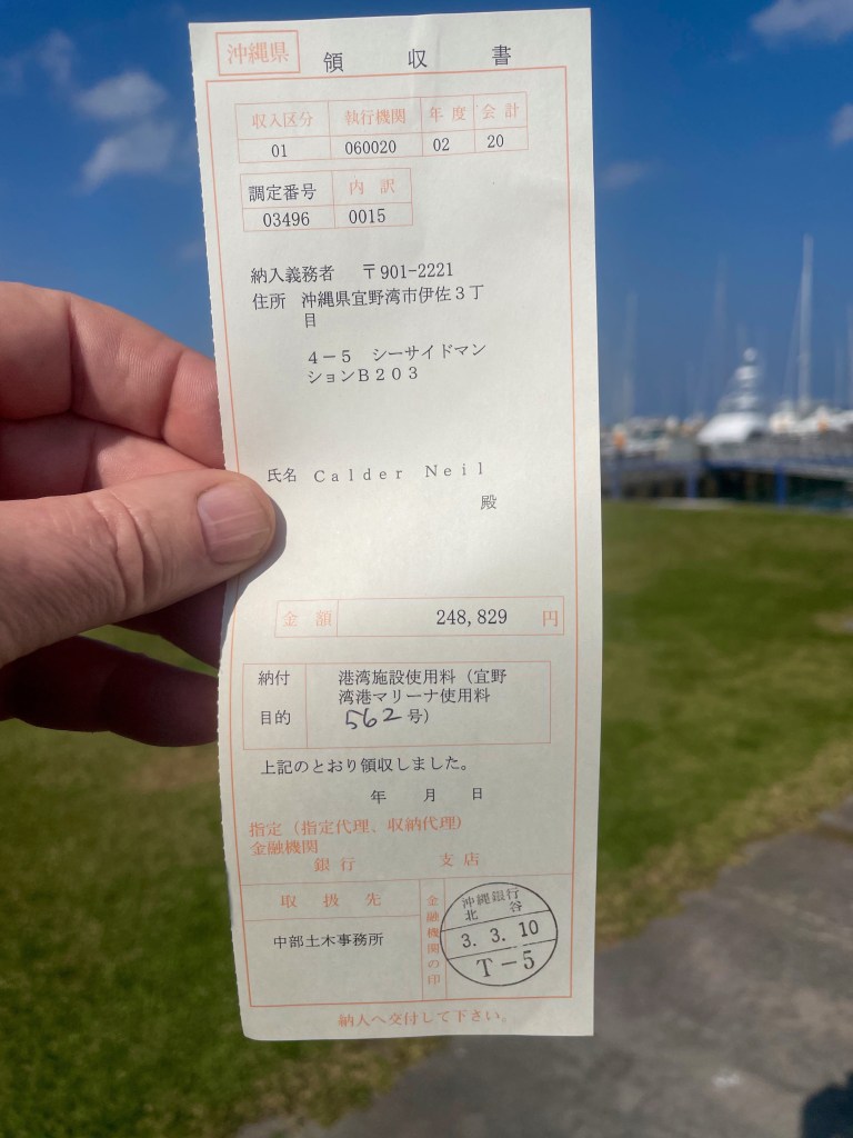 I pay the annual bill for my berth at the marina. They send you a bill that you take to the bank. There you take 250,000 yen cash from the ATM. This you give to one of the bank tellers who does something and gives you a receipt. This you give to the folks at the marina.