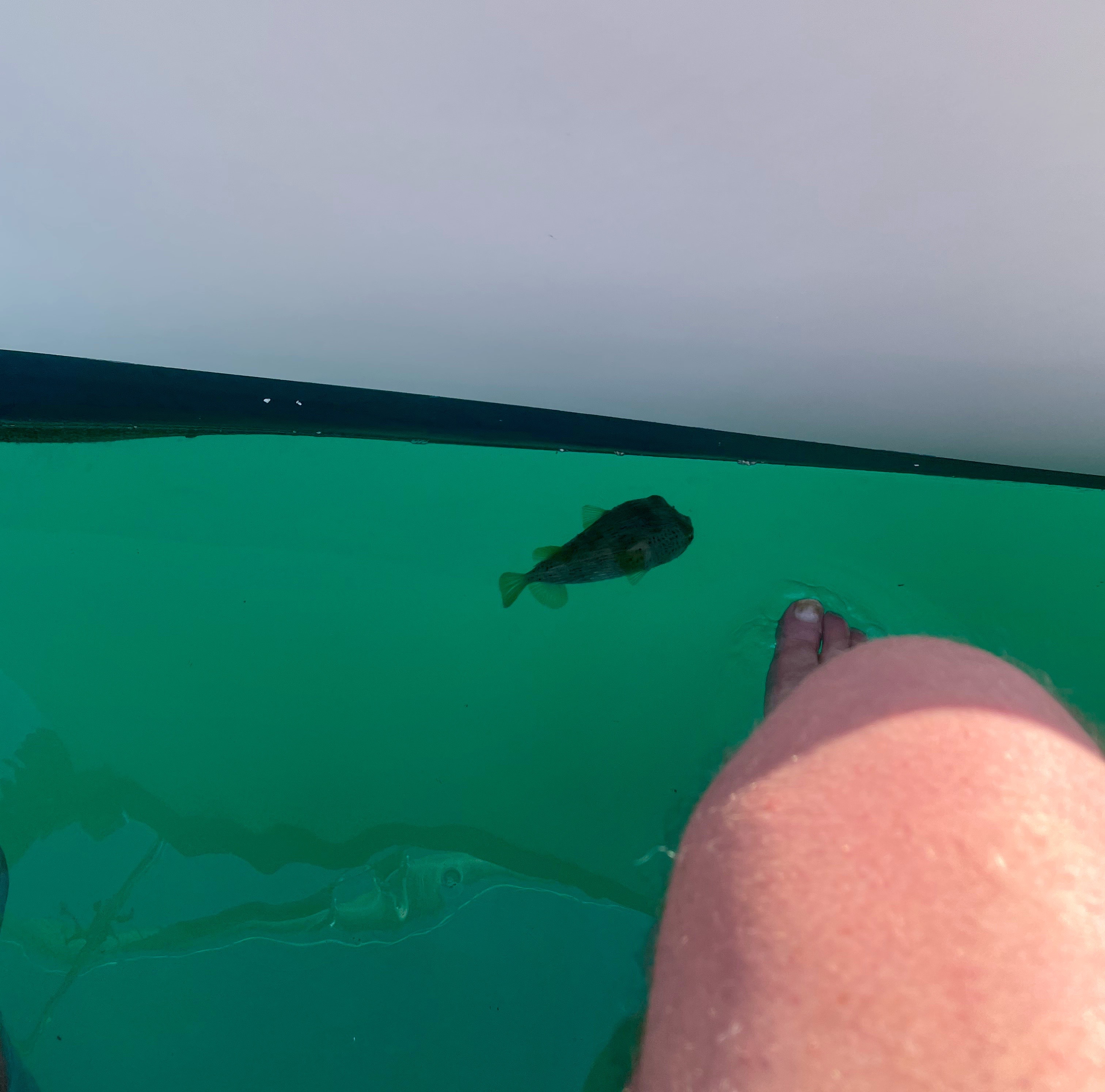 A puffer fish comes by several times and swims around my feet. It is fascinated.