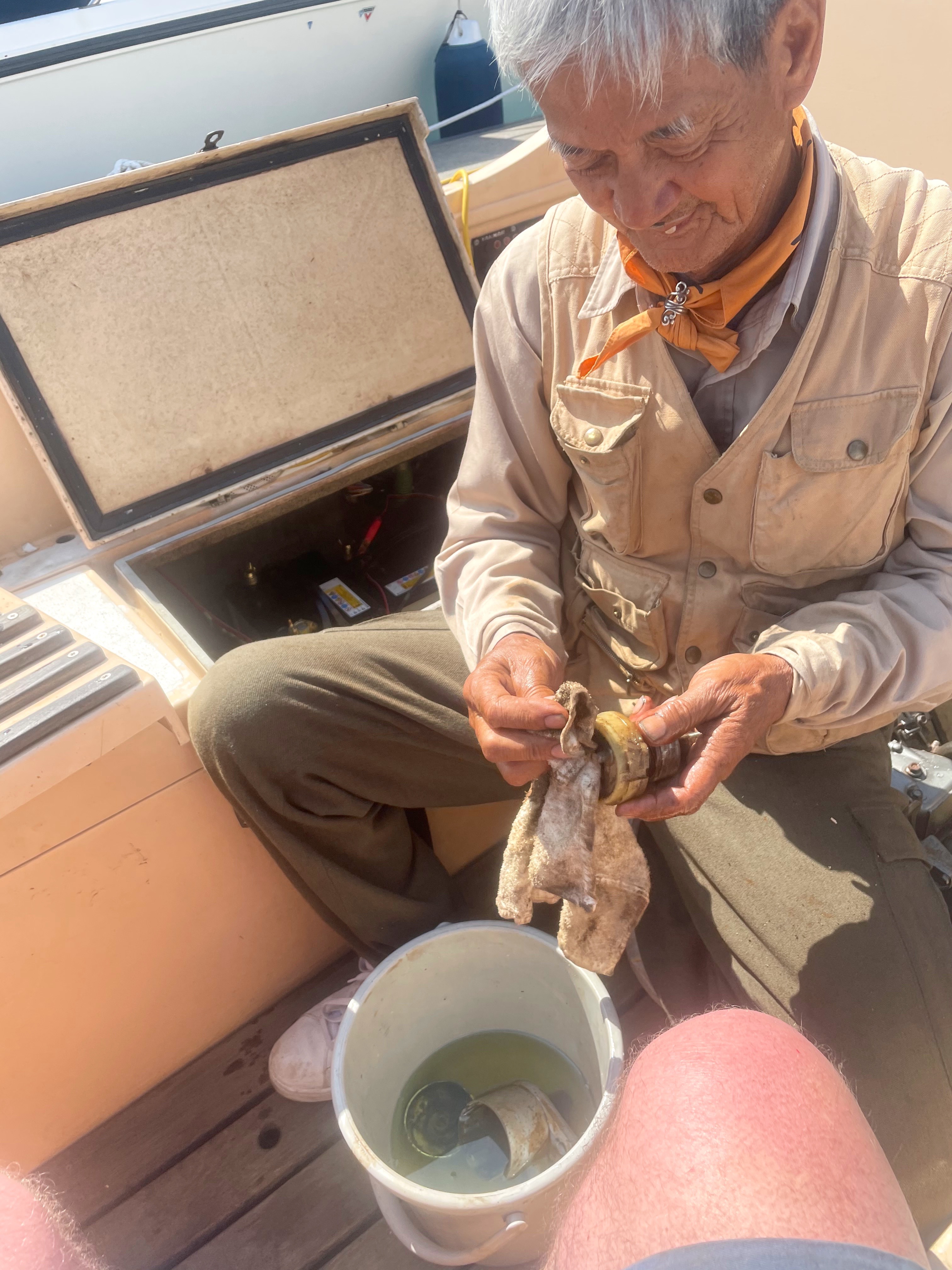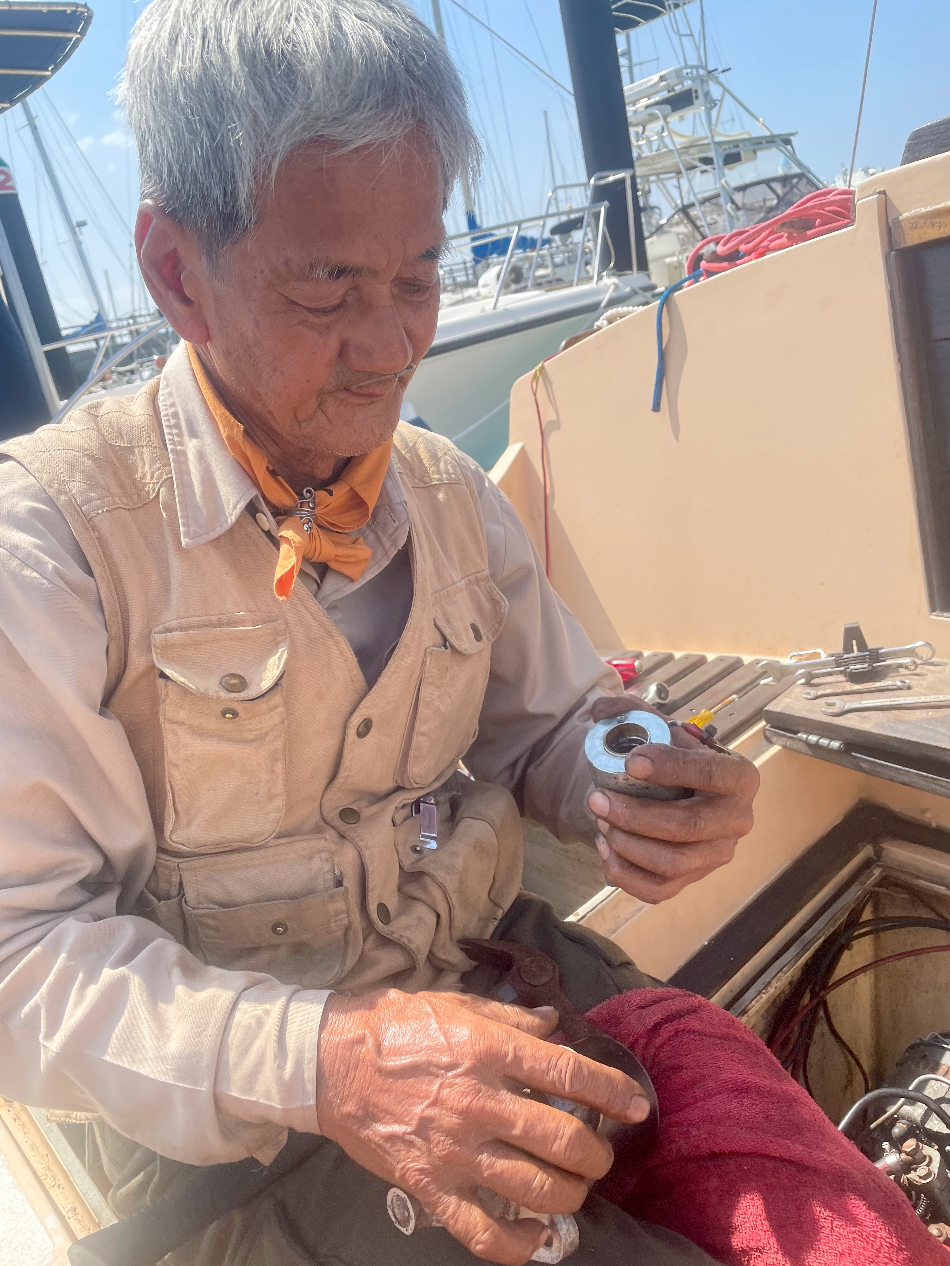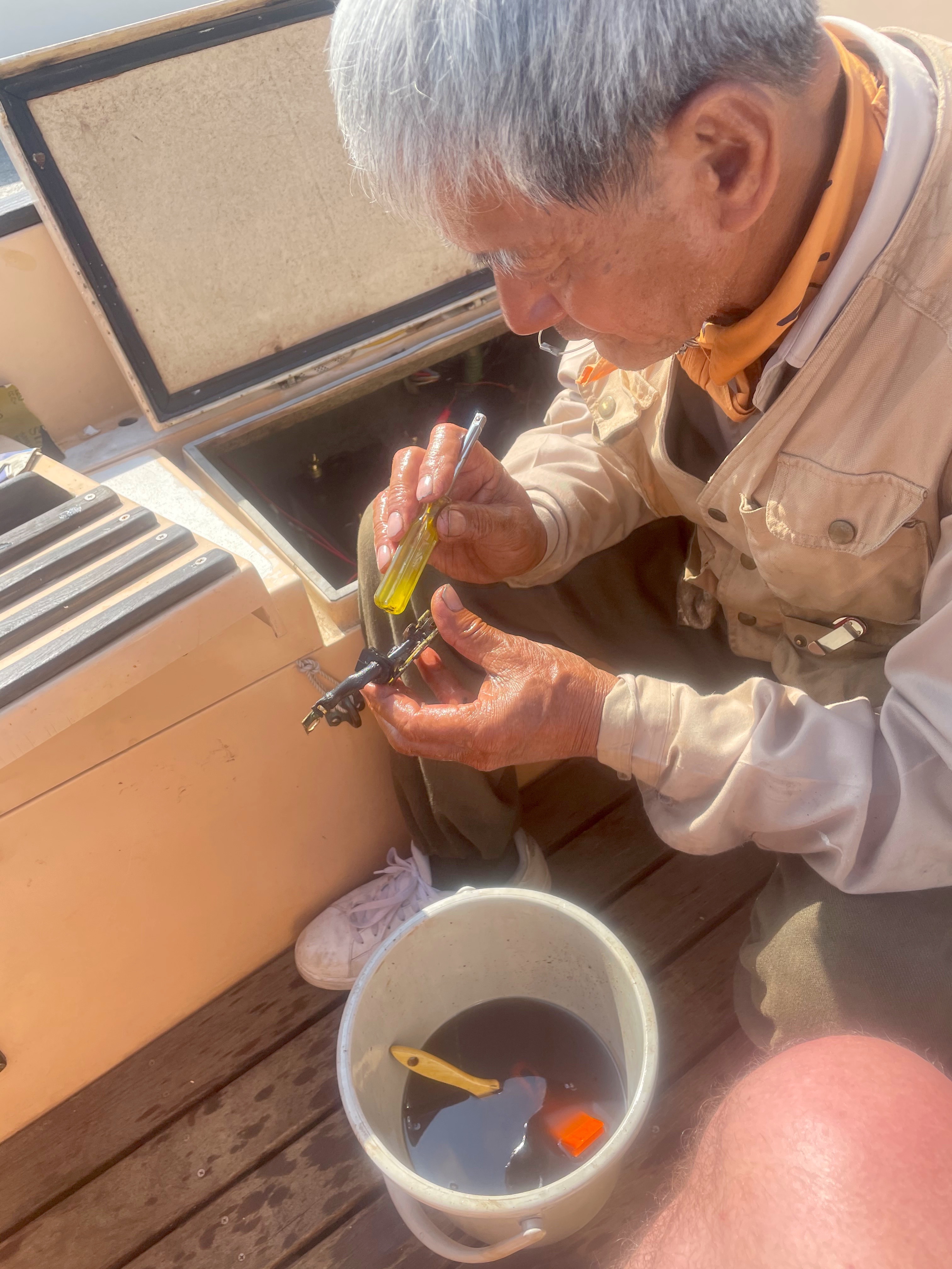 I have to leave but Kiyuna san goes to the Yanmar depot to pick up the new oil line. I can’t wait to see if he has installed it. Then the boat will be back in action