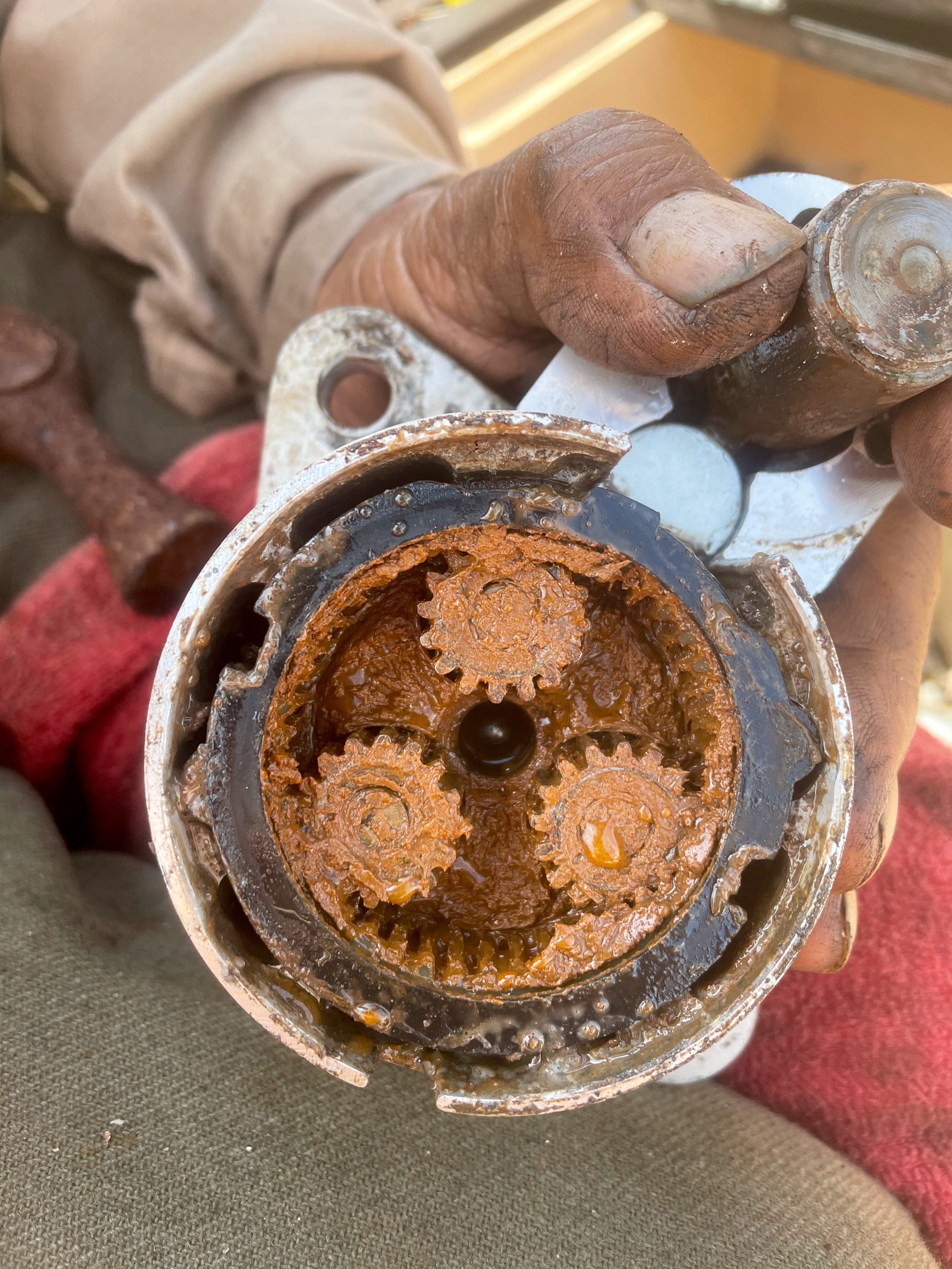 He dismantles the motor and we find that it is filled with red sludge. Where did that come from?