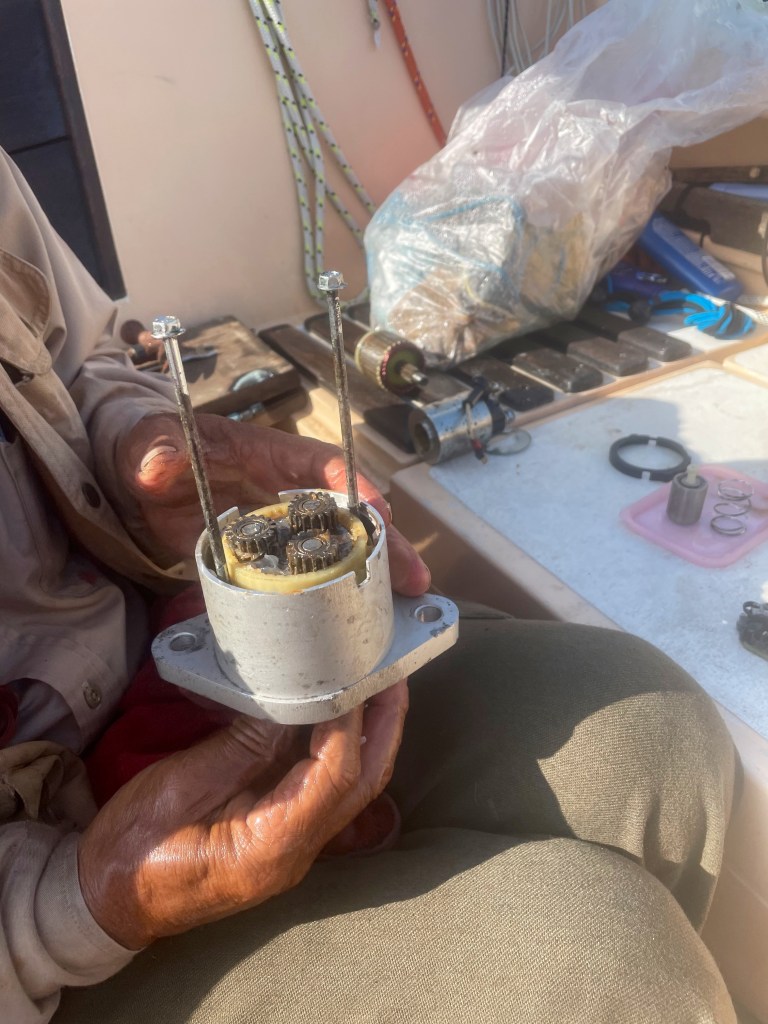 We have a great afternoon, sitting in the sun, cracking jokes and cleaning the starter motor. We do not have much common language but still have the best time.