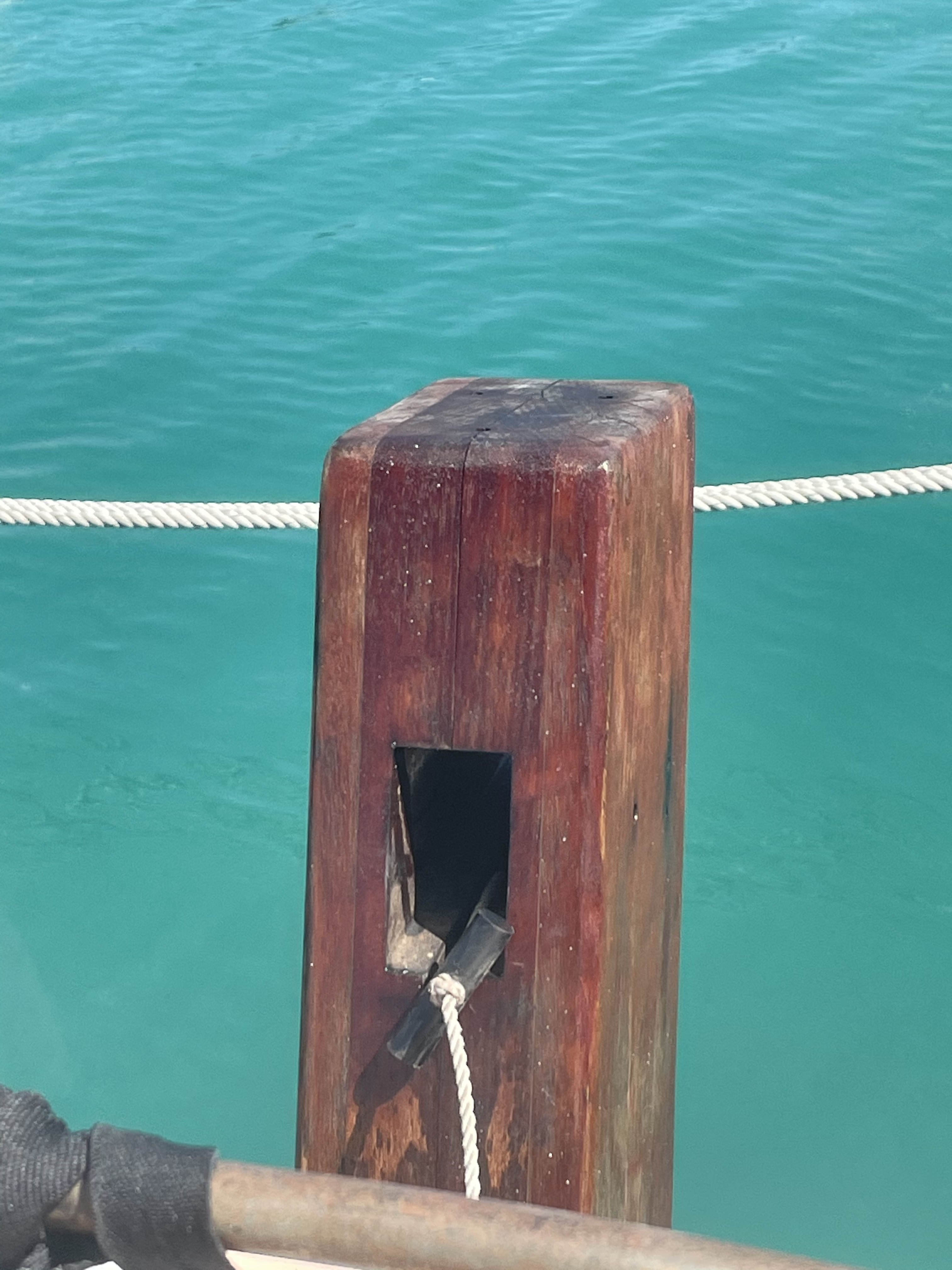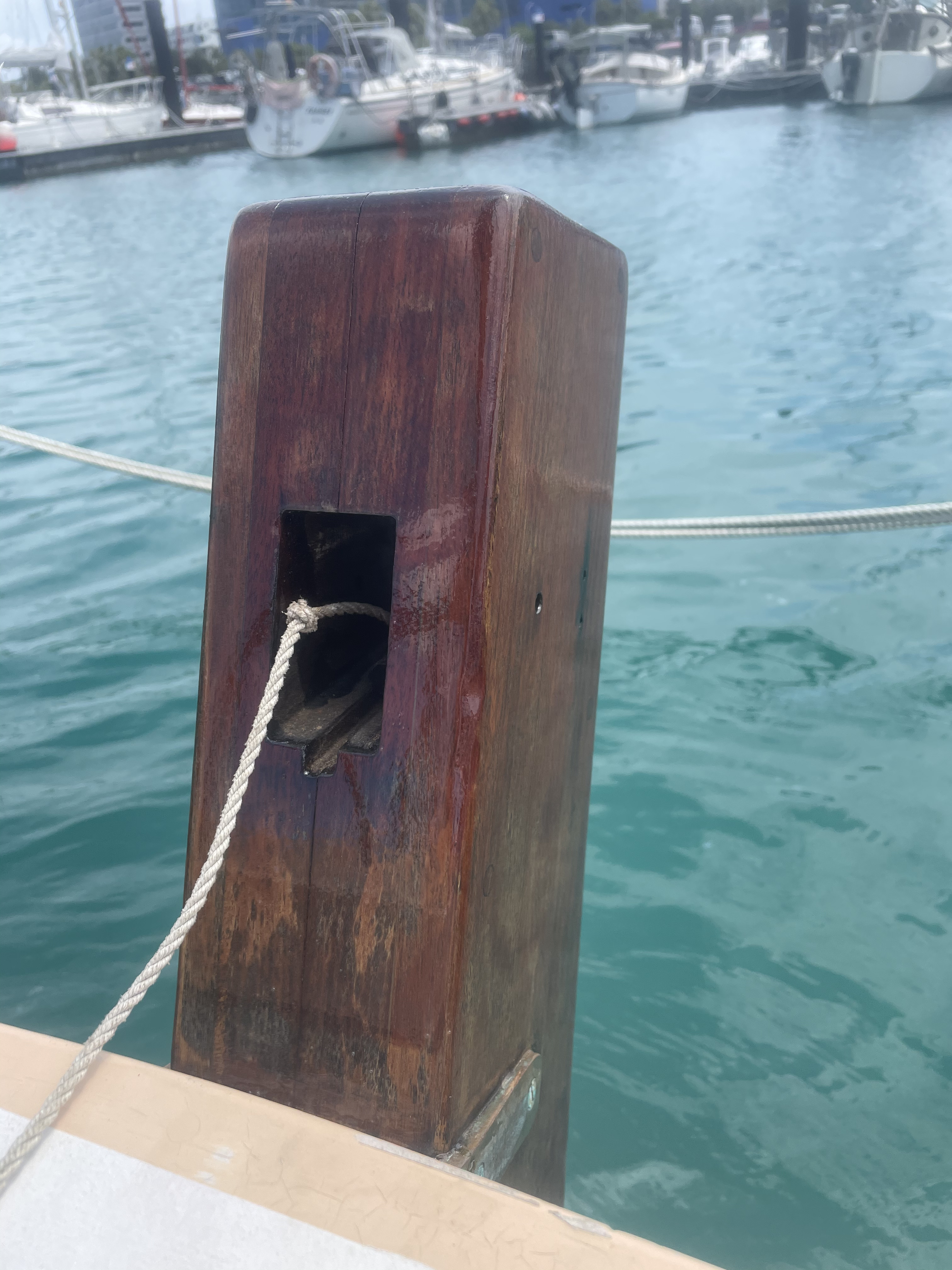 The Okinawan sun plays havoc with wood. The tiller and the top of the rudder – rudder post? – have suffered badly. I should have taken some “before ” photos to show the dried up state and the devastation of previous varnish but I forgot.