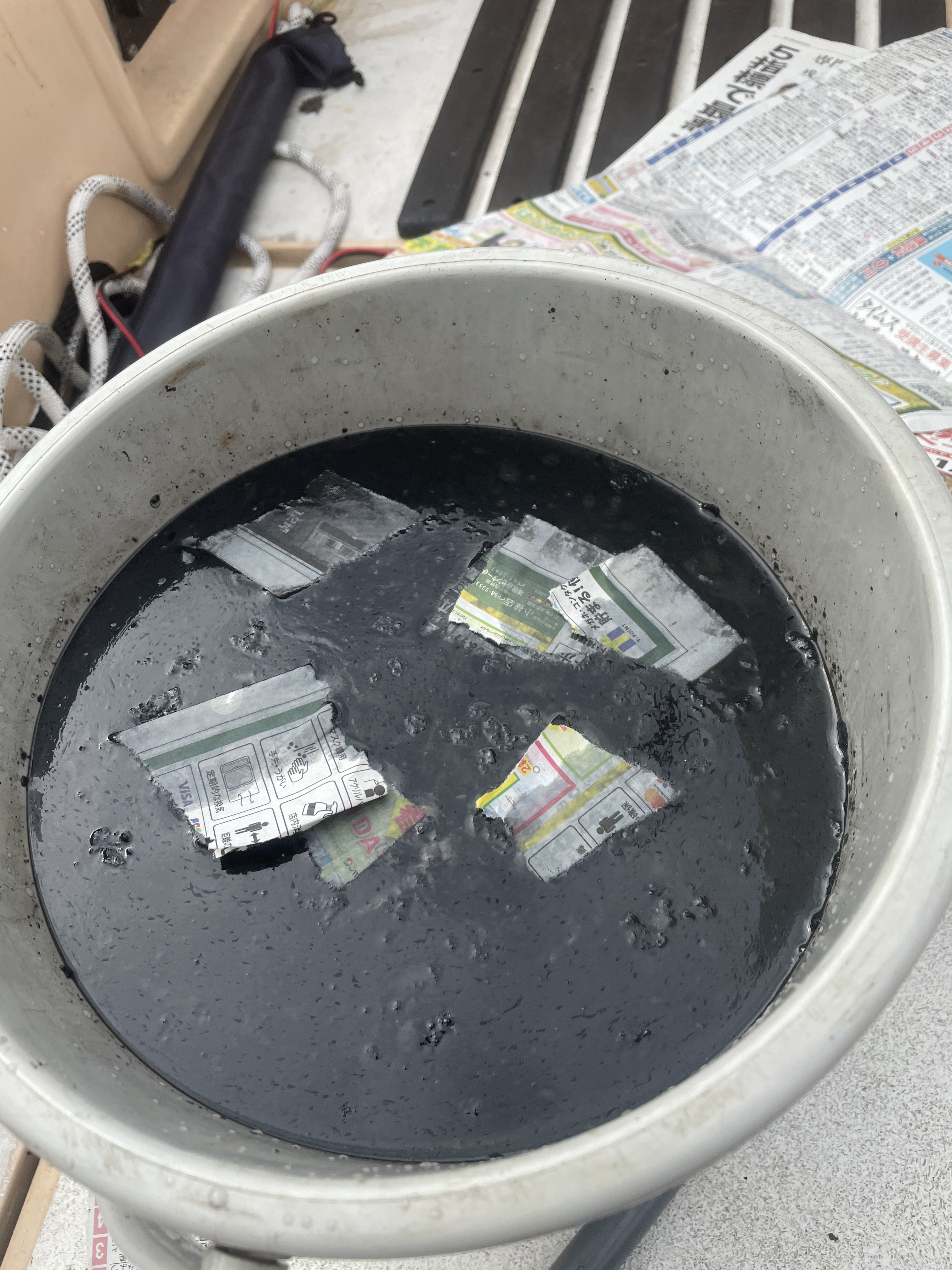 You will remember that I pumped out all the oily water from the bilge. Well it went into a big jerry can and the problem was where to put it. There is a old oil disposal drum at the marina but they do not want it to be filled with water. I pour the oil/water into a bucket and use the Kiyuna torn up newspaper trick. I shred huge amounts of newspaper and put the scraps onto the oil covered surface. They soak up the the oil very effectively.
