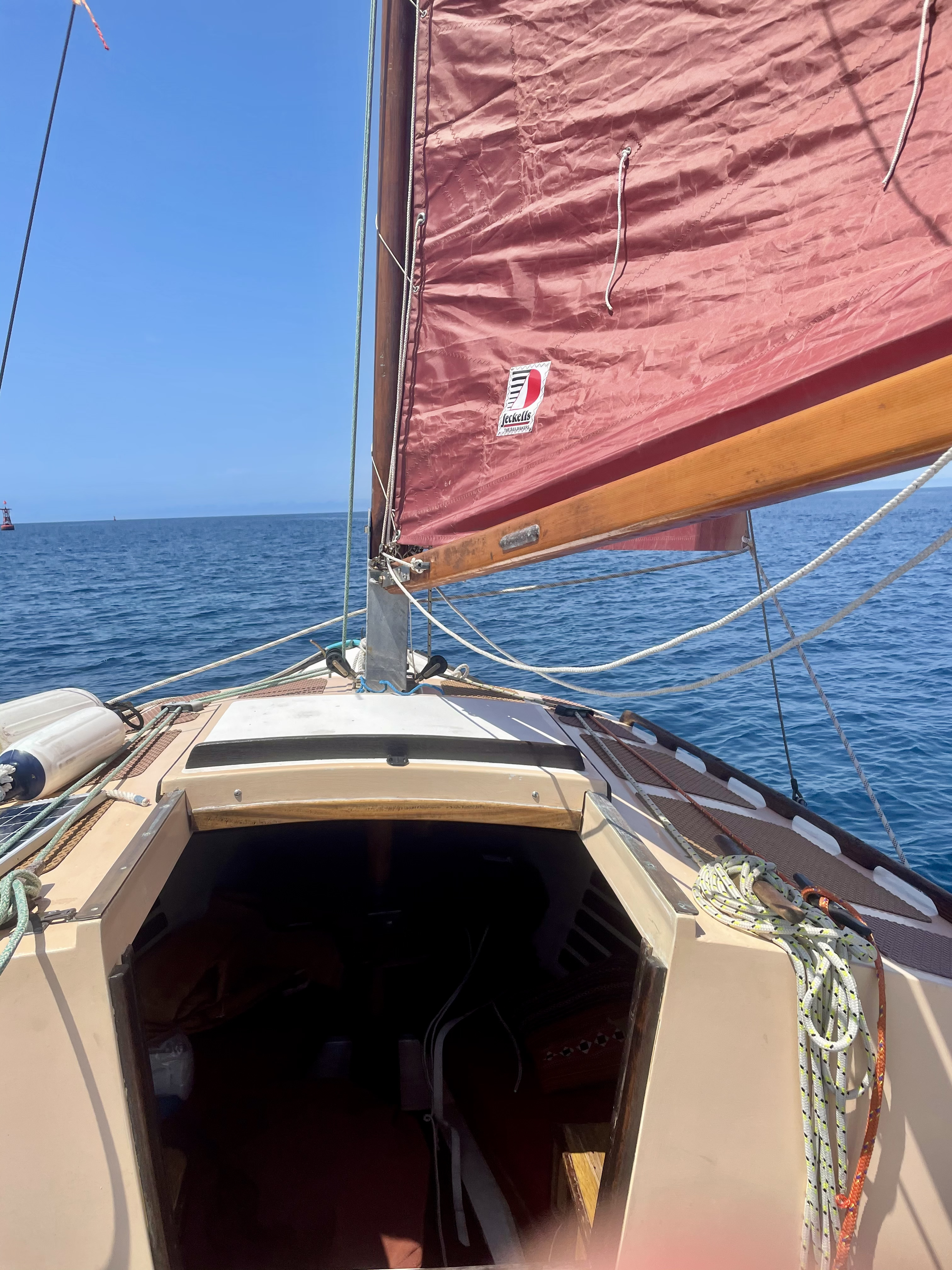 The Norfolk gypsy is a comfortable boat as you can put your back against one gunwale and stretch out your legs onto the lockers on the other side of the cockpit. You are nearly lying down as you watch your legs frazzle.