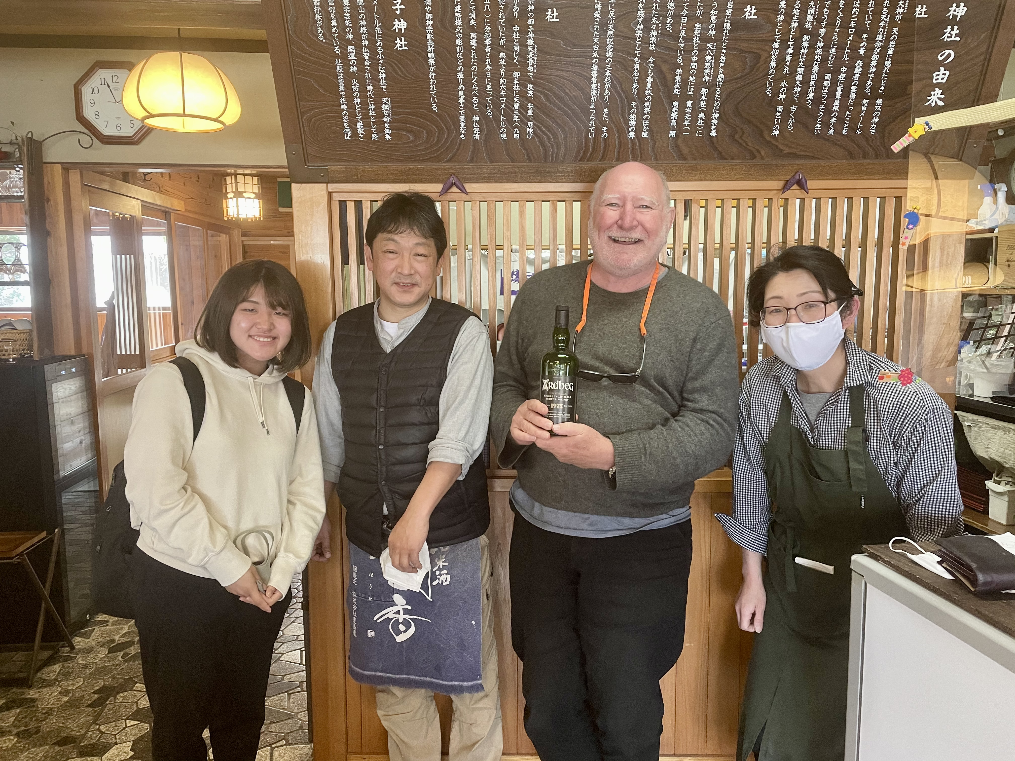 The restaurant where we eat our soba lunch is festooned with empty bottles of Islay whisky. I mention that Islay is my breeding ground and all hell breaks loose! The adorable couple who own the restaurant spent their honeymoon on Islay. They named their daughters Islay and Ellen, after Port Ellen.