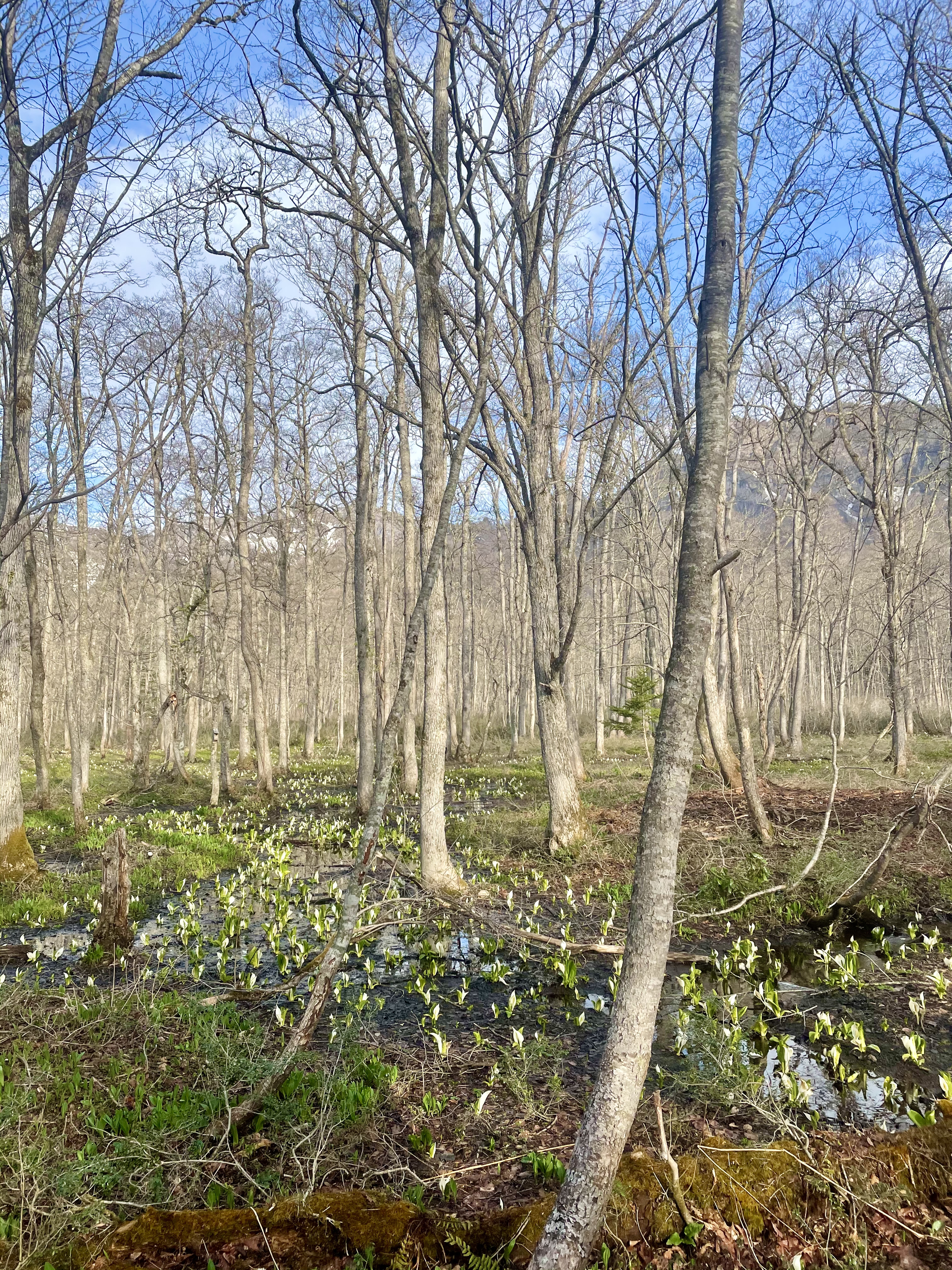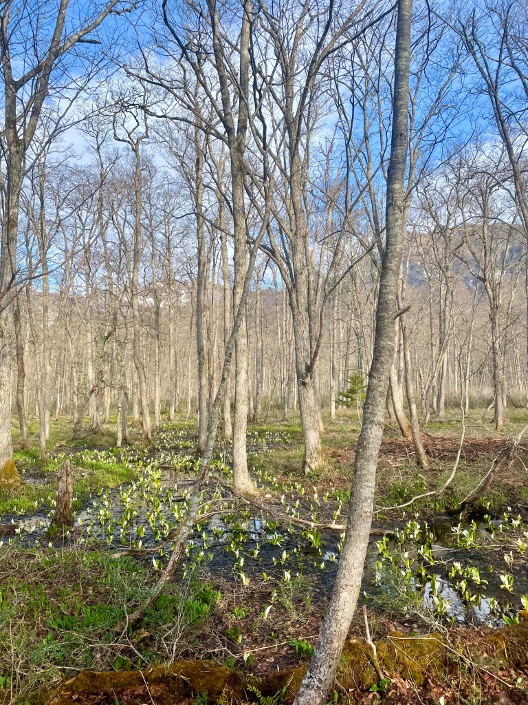 Togakushi is famous for birds and we are here to look at them. At 6:00 we are tramping around the Togakushi Botanical Park. There are several other birdwatchers there, most equipped with huge lenses and telescopes. The park is wooded and marshy and everywhere there are Mizubasho, which in English have the feeble name of Peace Lilies.
