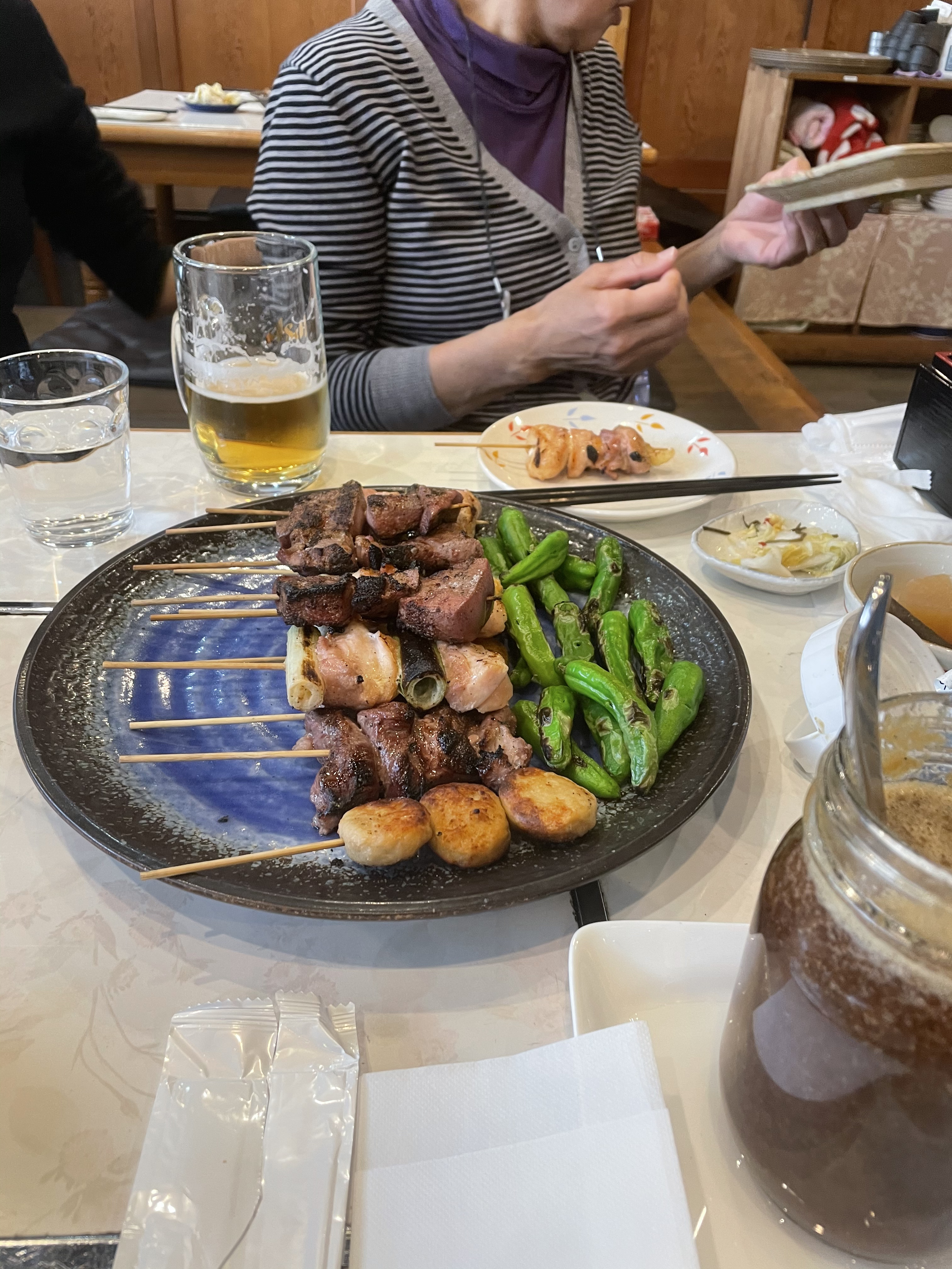 Our last meal together was back in Ueda the evening before the return to Okinawa. Tomomi san and Miyoko san take me to a Yakitori restaurant. I am a bit underwhelmed, as my vision of Yakitori is little bits of chicken on a skewer covered with sticky brown sauce. Not in Nagano!