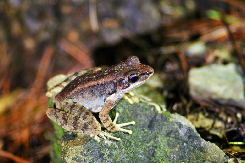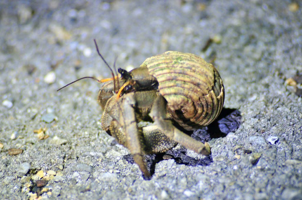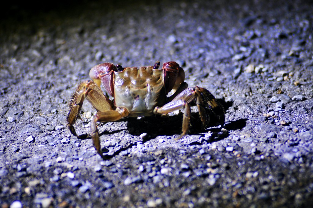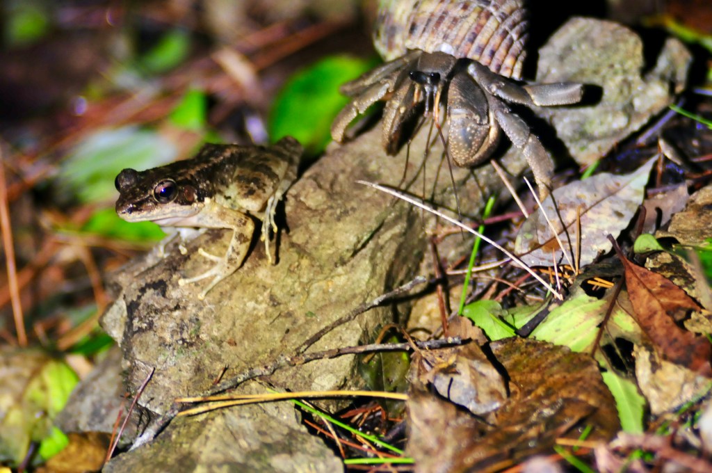 We go to a waterfall; the ground is teeming with crabs and frogs.