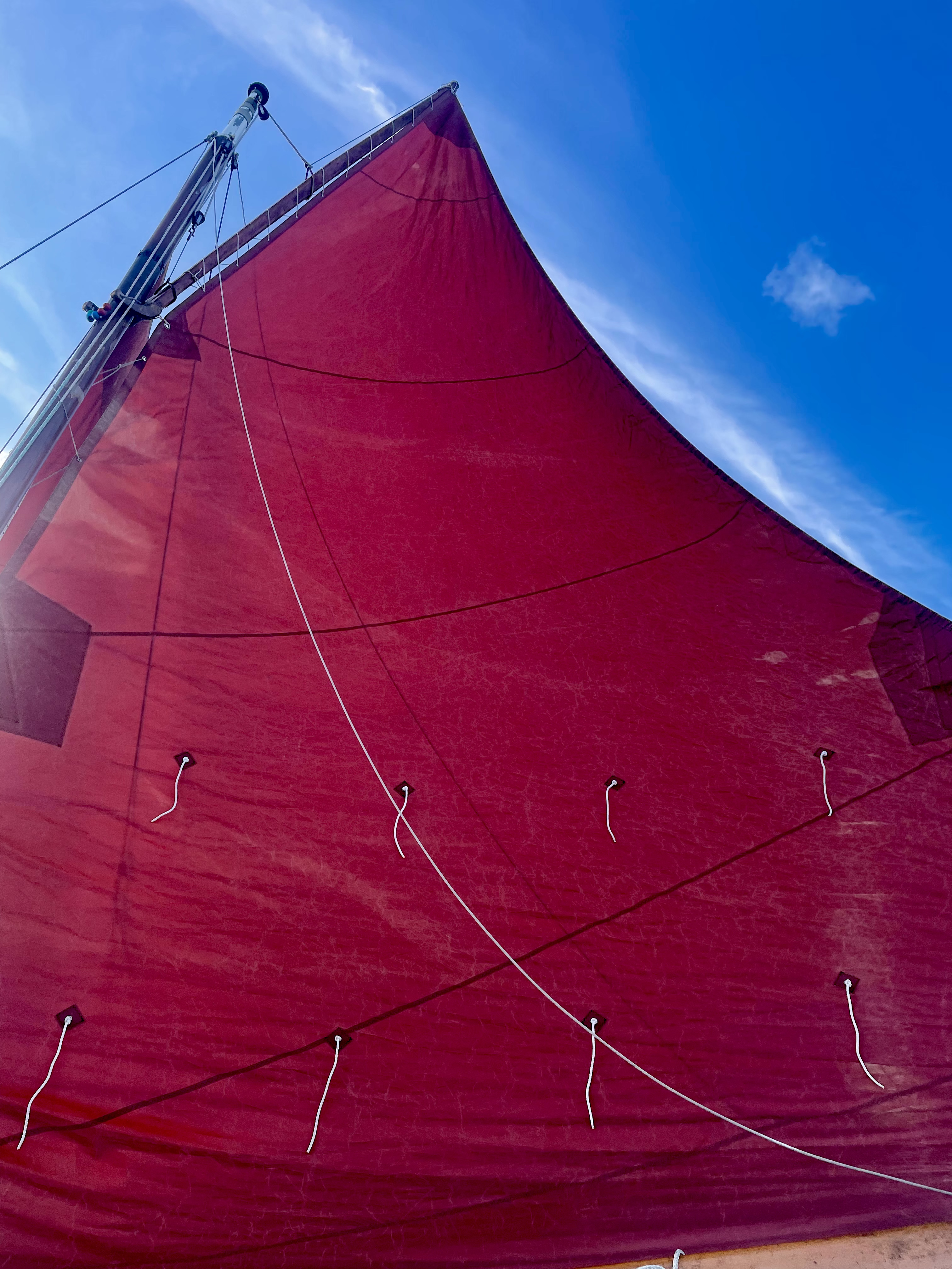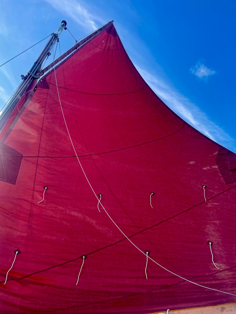 I stop the motor and we glide away. I re-attack the halyards and now mysteriously I can pull both the throat and peak up a vital 6 inches. The mainsail is perfectly set.