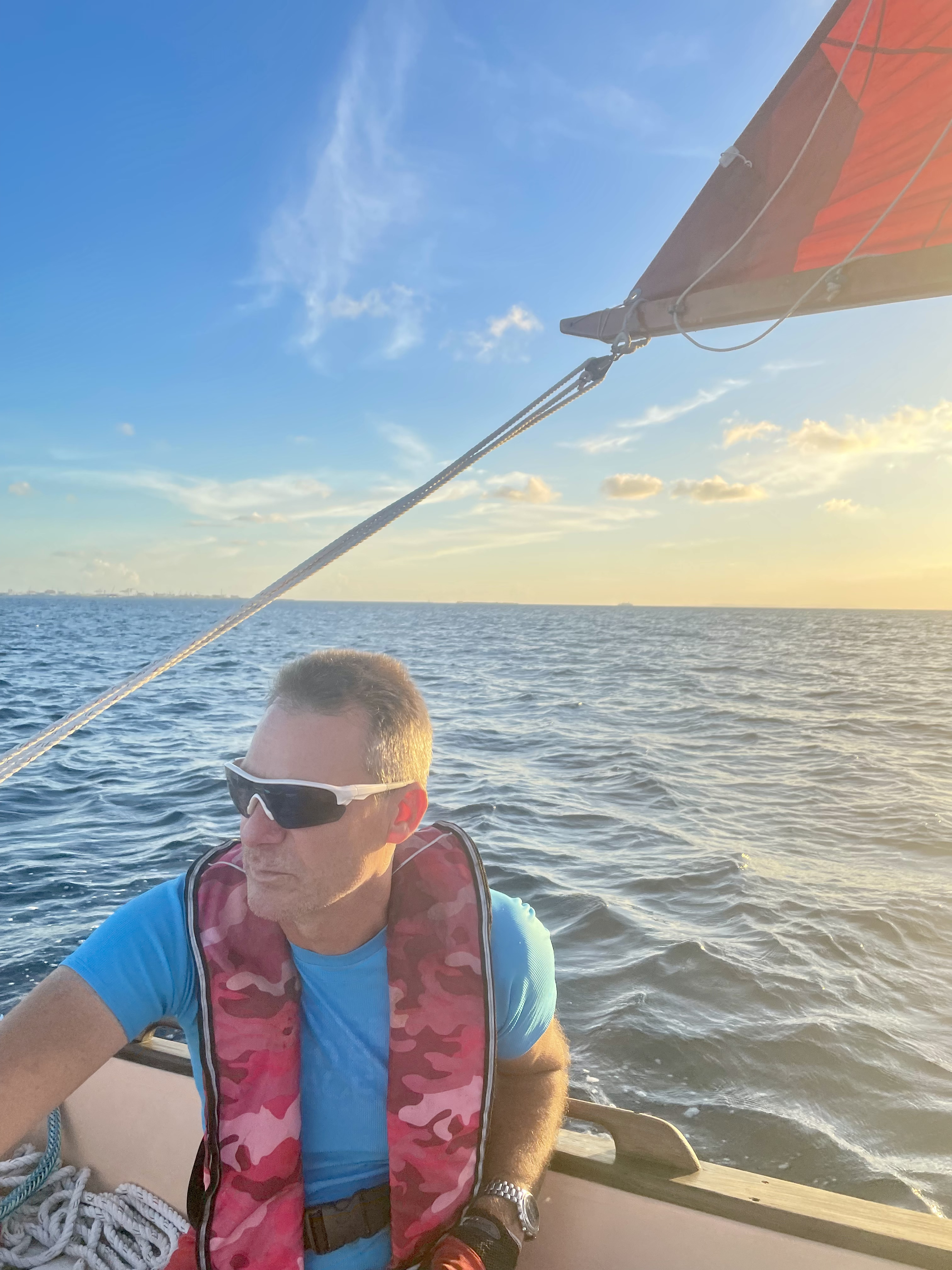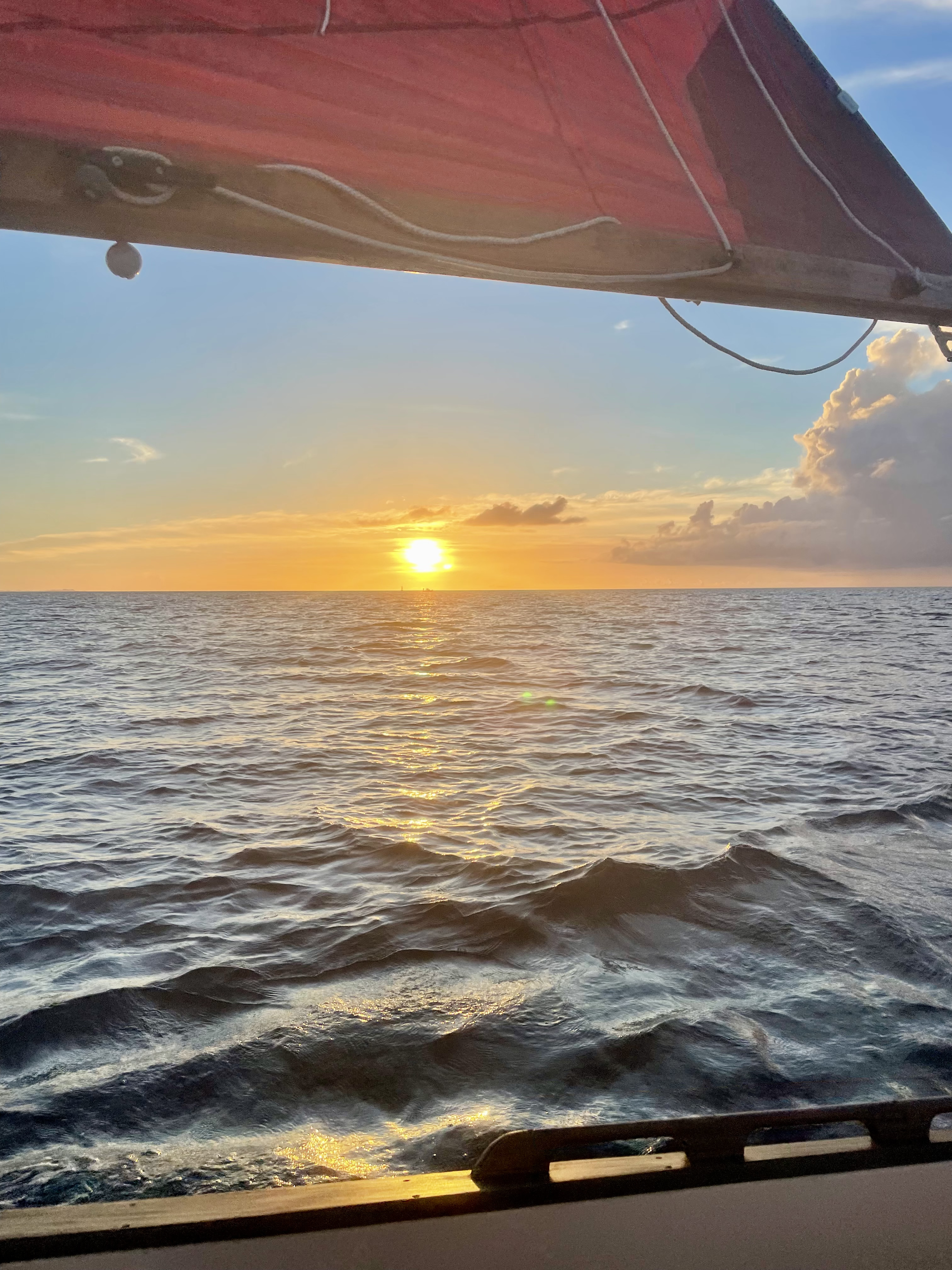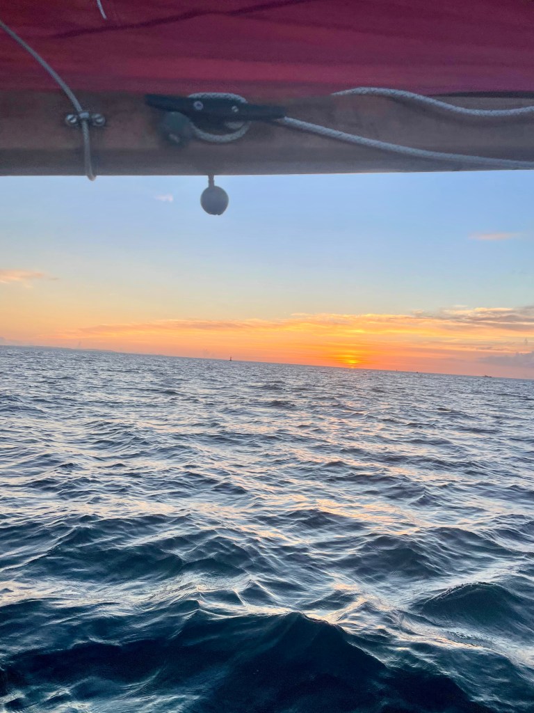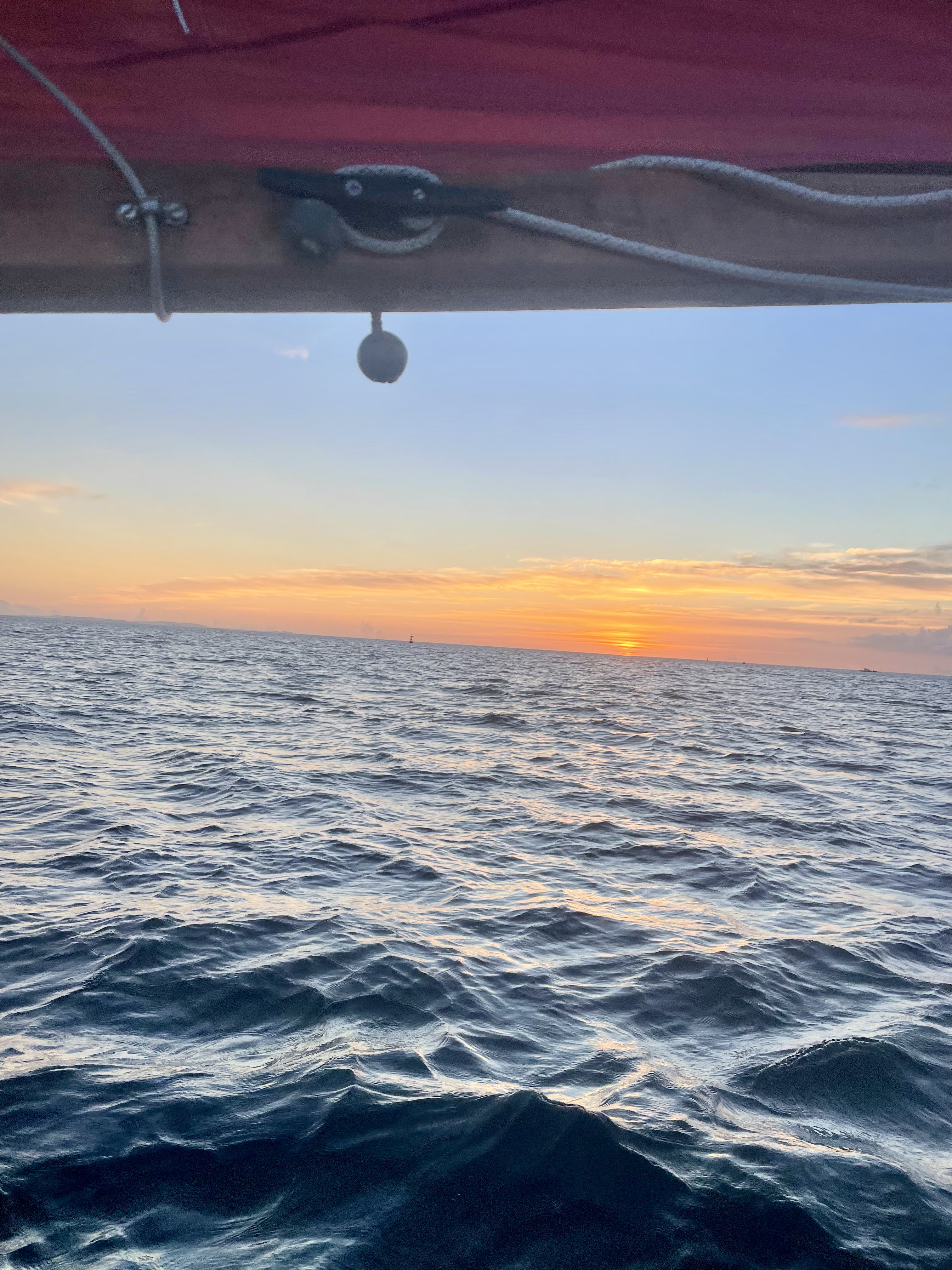 Harry and I set off at about 6:00 pm. I raise sail in the Marina basin. It is not good. I cannot get the the mainsail taught and there is an ugly crease across it. No amount of tugging on the halyards makes any difference. We motor out of the Marina into the setting sun.