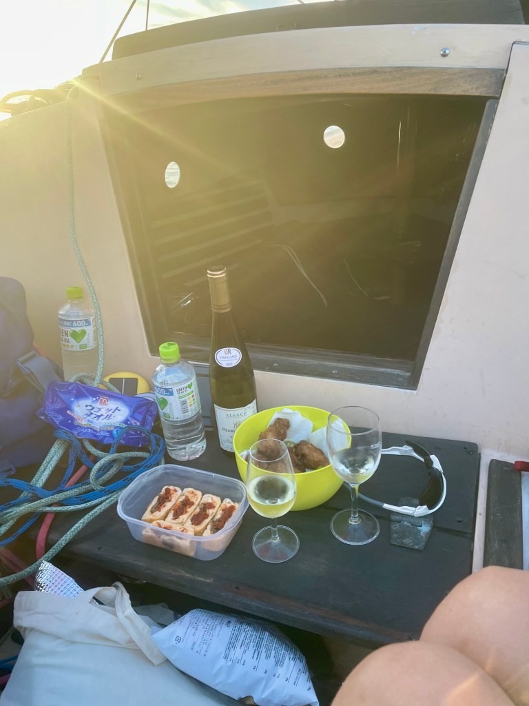 Arisa has cooked an amazing meal; deep fried chicken drumsticks in spicy batter, egg with a minced beef centre smeared with harissa. We drink cold riesling from Alsace. Such a good life.