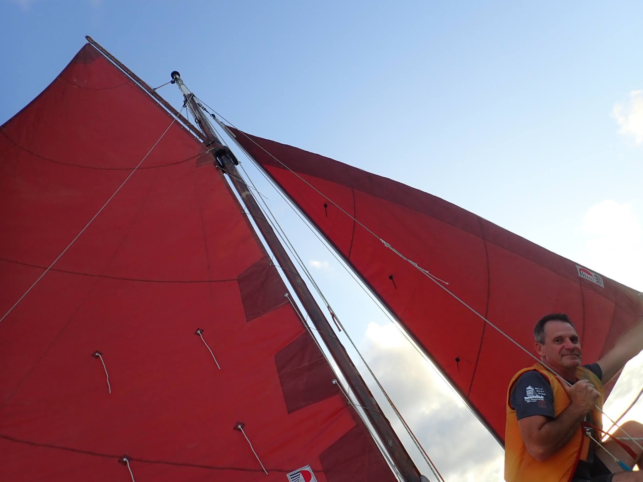 We go on a run out to deep water and then bear away to sail up the coast. The wind is gentle, the sea is deep blue and also gentle.