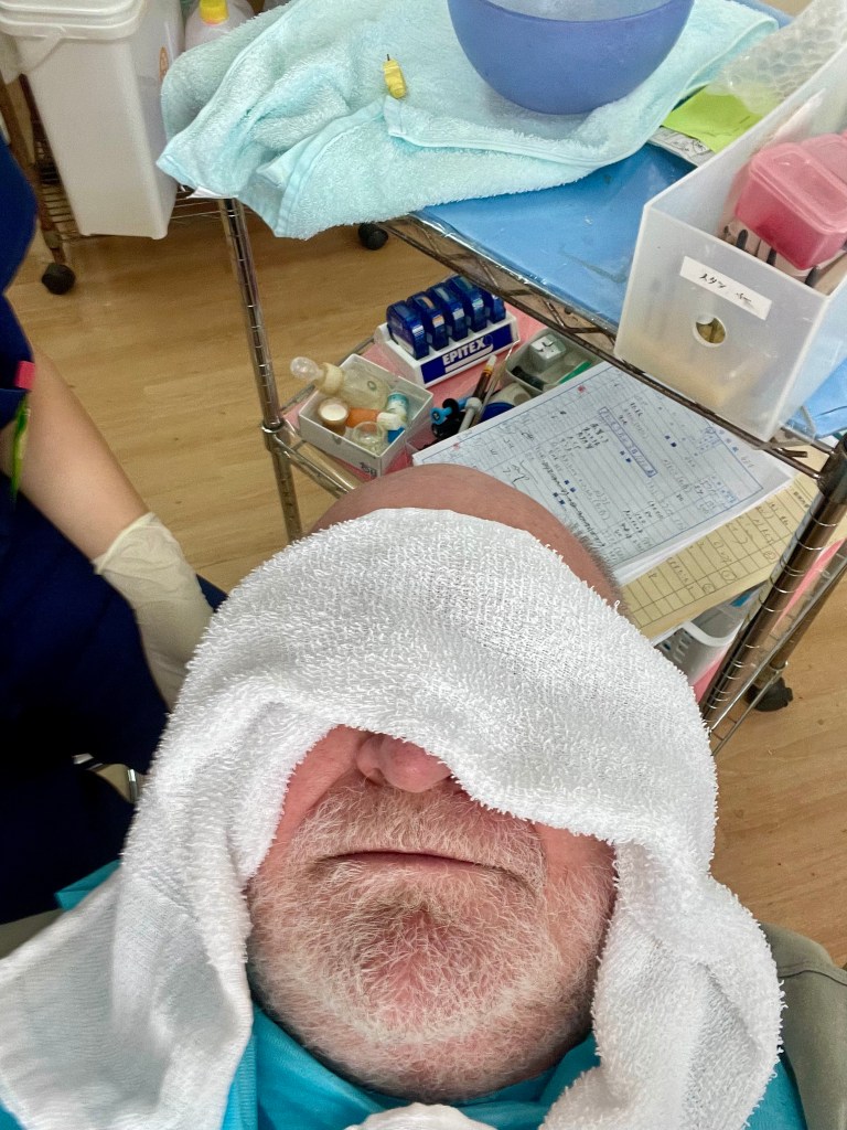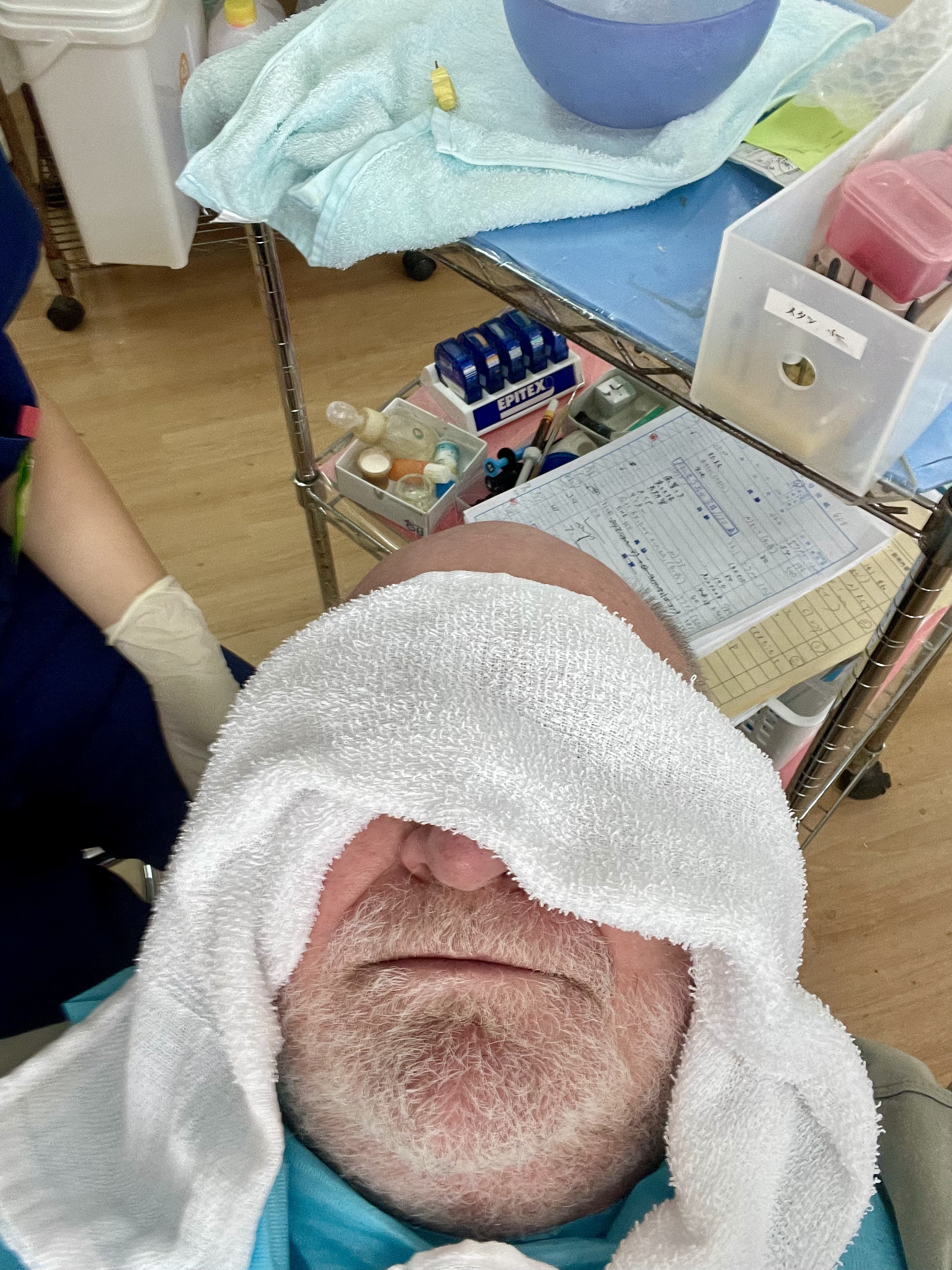 The nurse places colored paper between the crown and the upper teeth. “Tap, tap, tap.” then grind, which in Japanese is “Giri, girl, girl.” They must have done this 50 times. They take delicate grinders to the crown and the crown seat so many times. I feel like saying, “You know, I think that will be OK.” but they have such high professional standards. By the way, this is State medicine. I pay next to nothing.