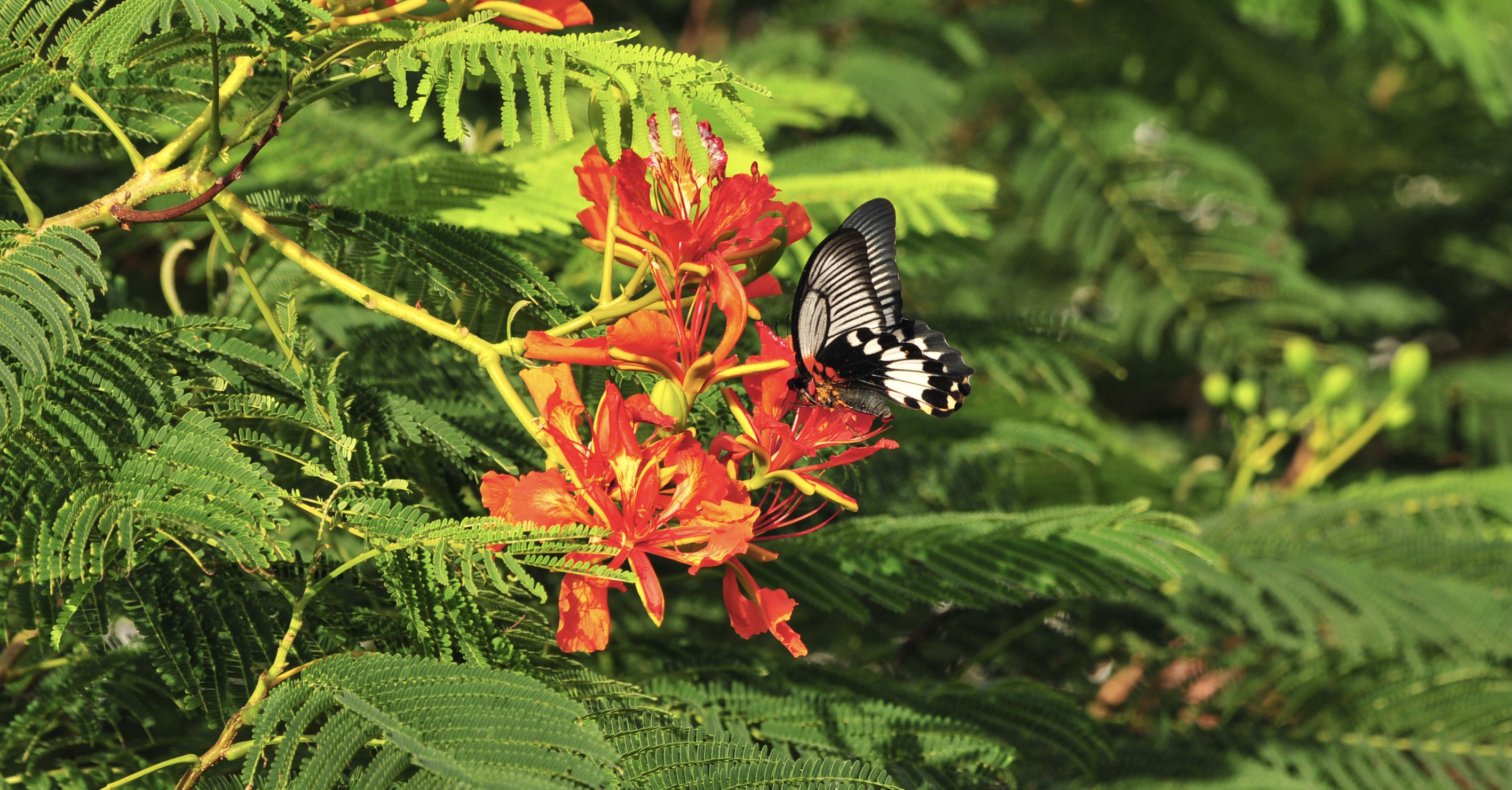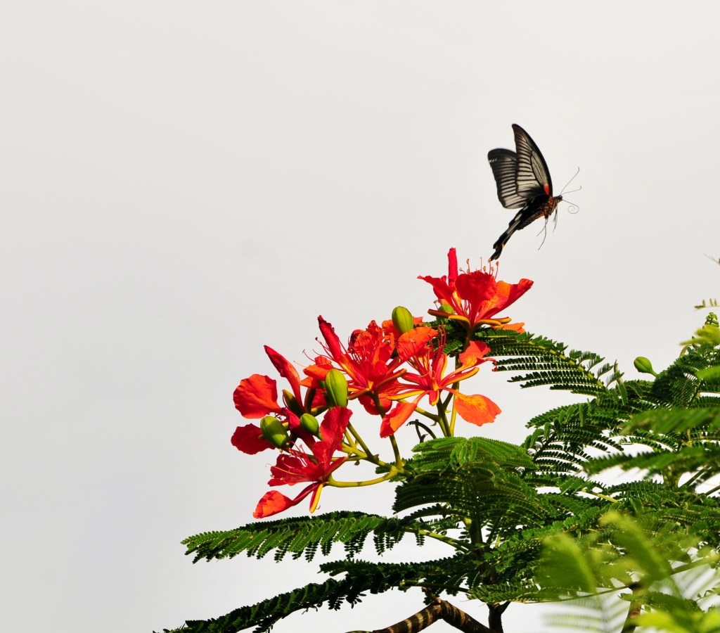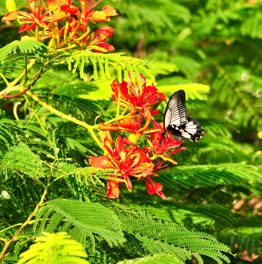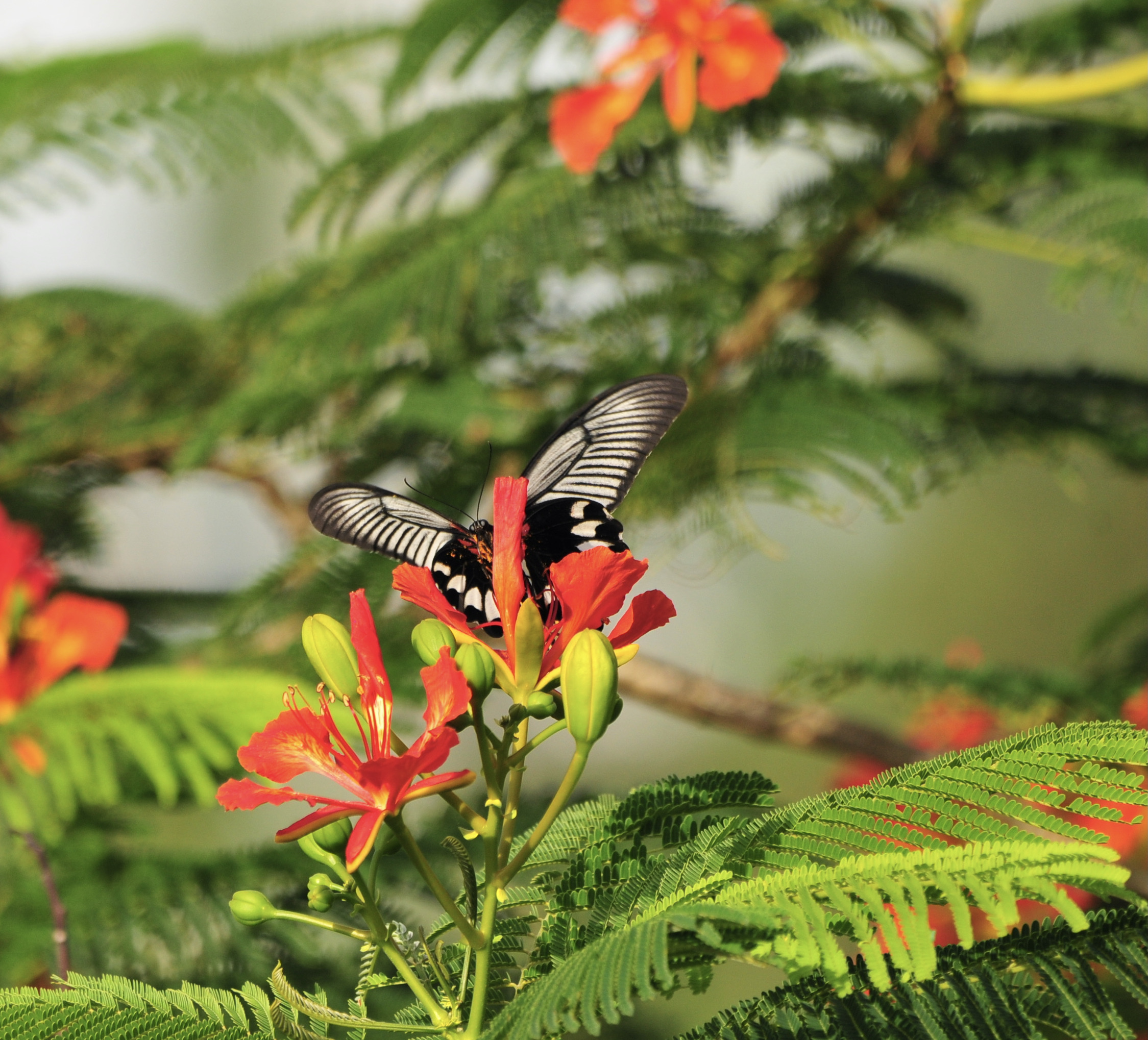 Back to the hotel, outside of which there is a tree covered with flaming blossom. The blossom are covered with butterflies.