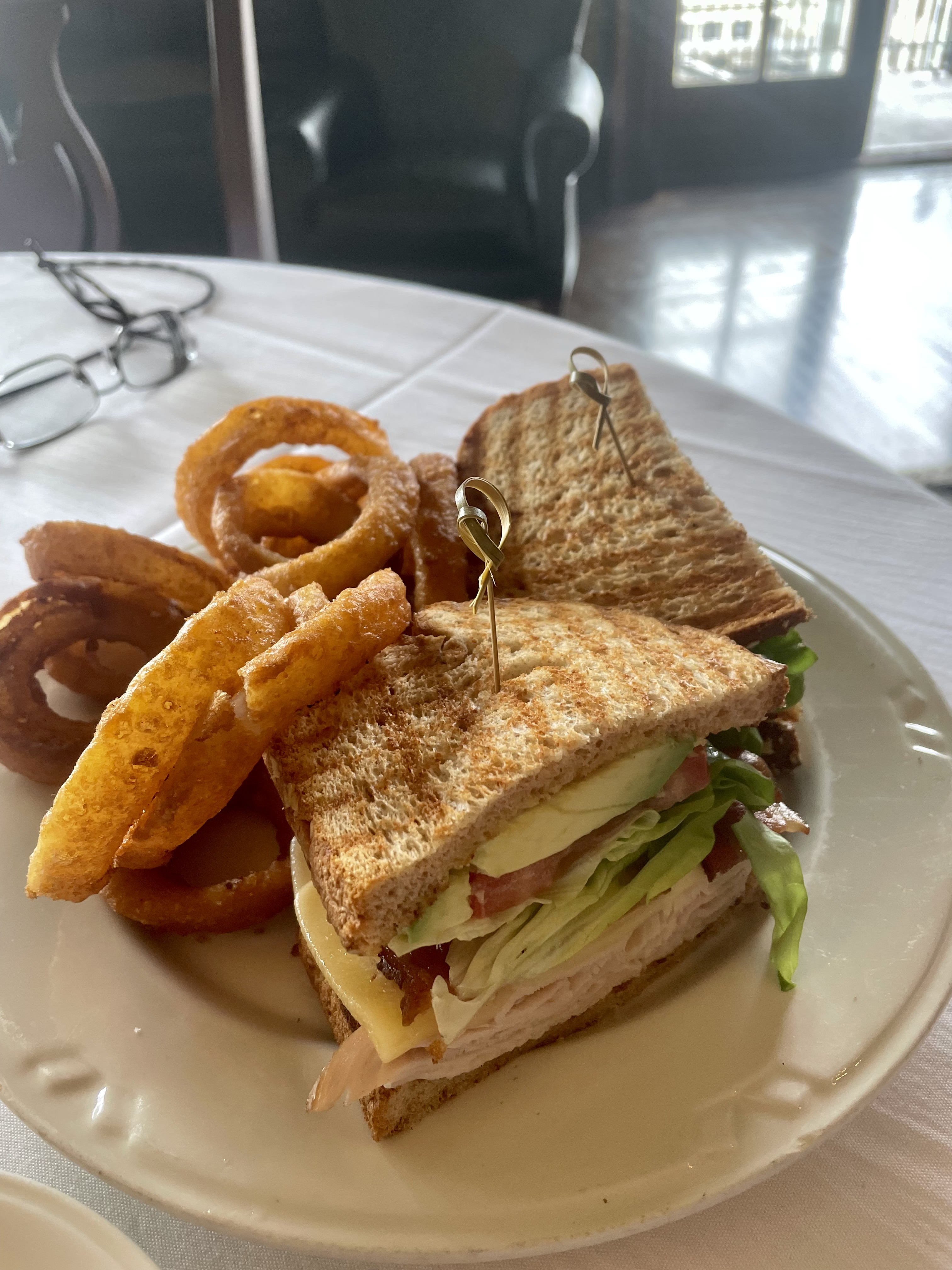Early 20th Century building downtown on Powell. Inside it is brown leather and old wood. I think they took London gentleman’s clubs as models. Great balcony outside the dining room that overlooks downtown San Francisco. We drink margaritas in the warm sun.