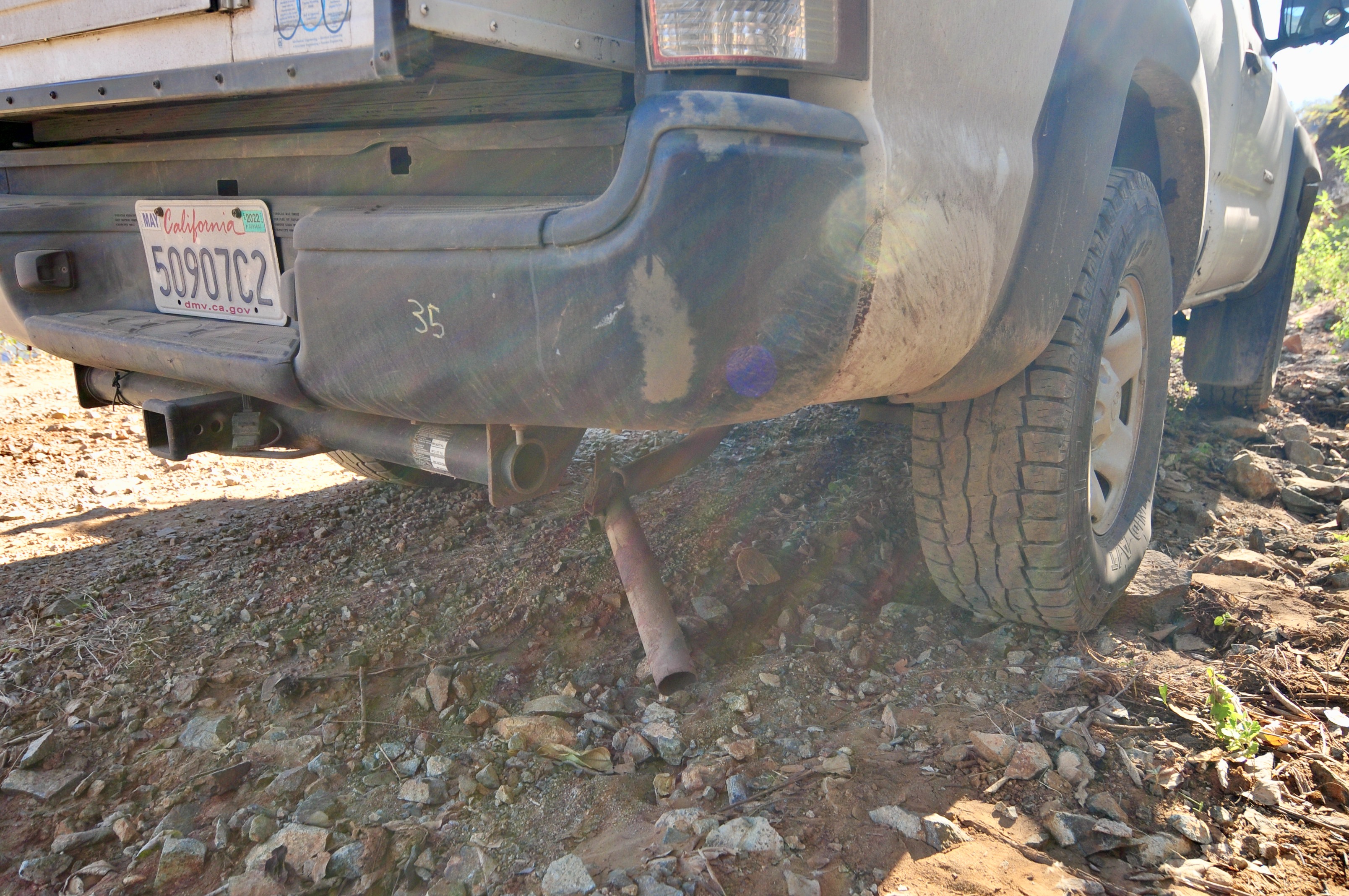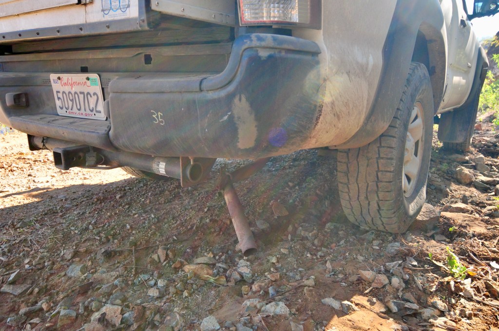 Every thing starts well and the noble Tacoma, in 4 wheel drive and low ratios, grinds up to the bottom of the cliff. Then the exhaust pipe falls off. I notice this because of loud clattering and much enhanced engine noise. Oh dear.