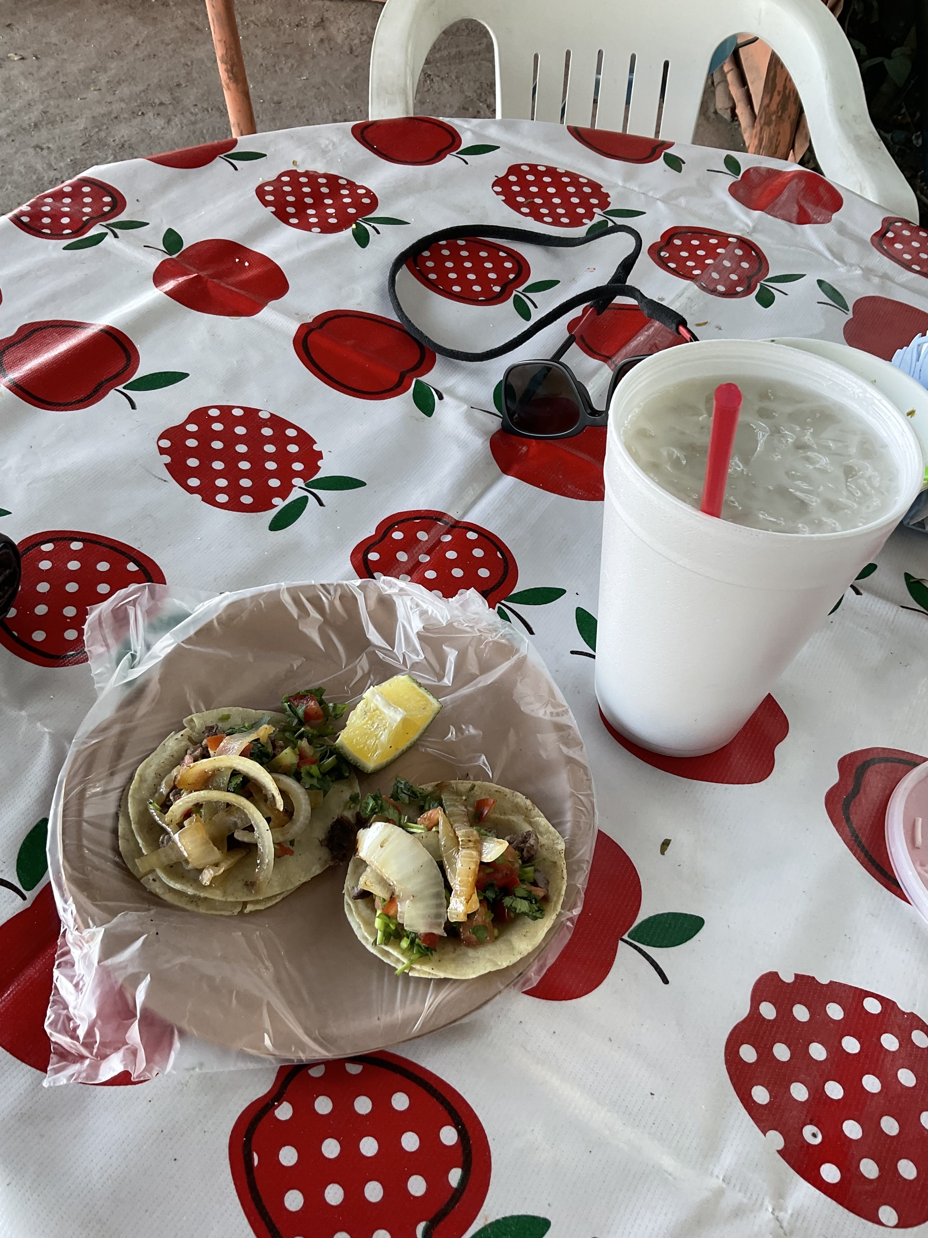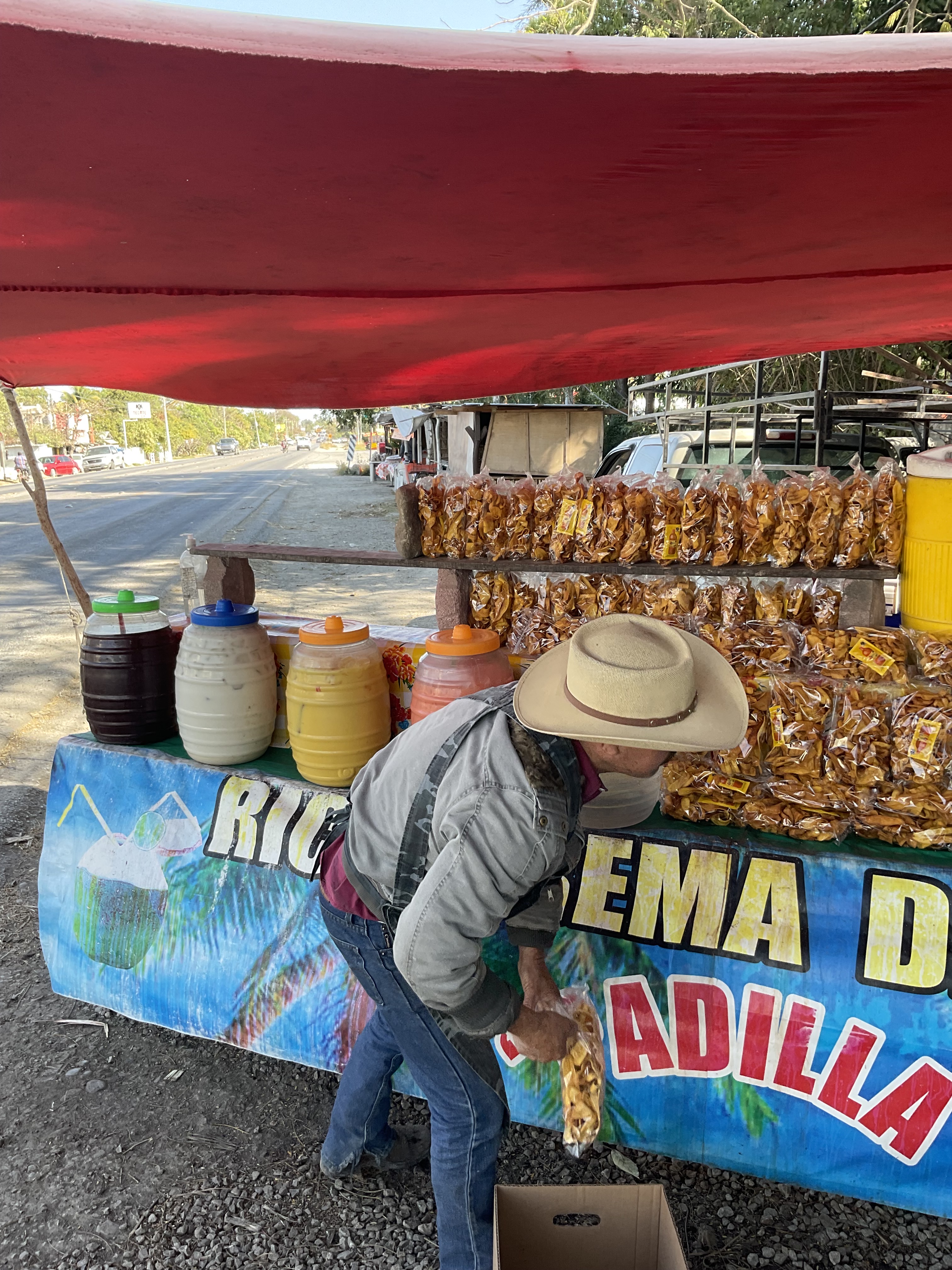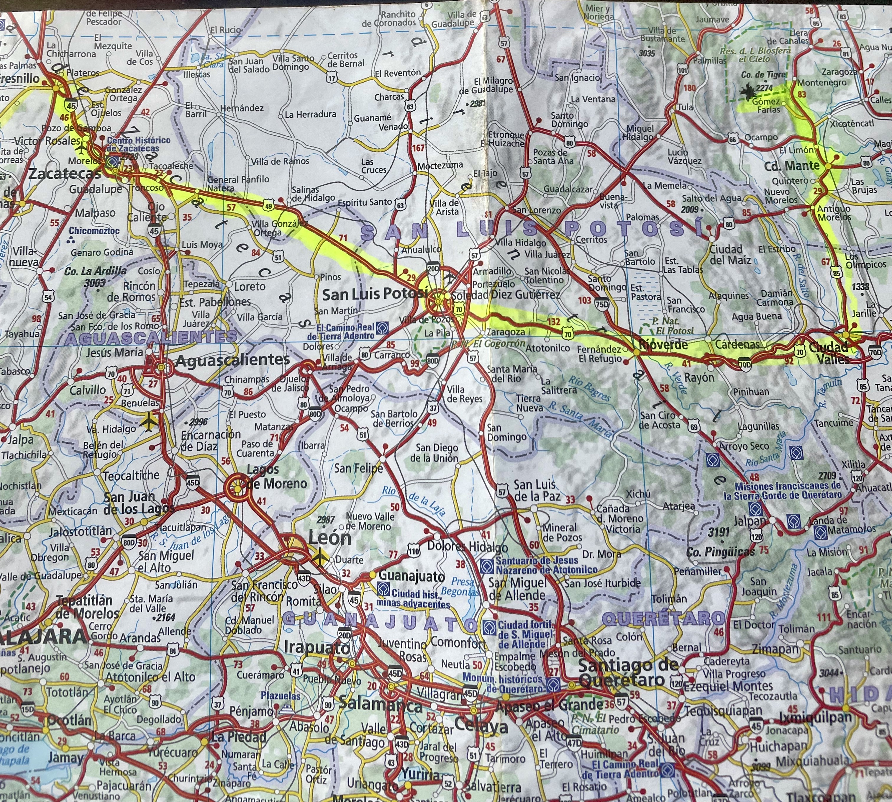I drive for 2 days from Fresnillo over flat desert plains. It is a dull trip made worse by a ghastly 2 hours trying to find my way out of St Luis Potosi. However even the grimmest road journey in Mexico is made bright by the rows of stalls that line the road on the way into and out of anywhere. Tacos, birria, burritos, carnitas, fruit of every sort, cold fruit juice, coconuts, roasted maize, steak and kidney pie, etc, etc.