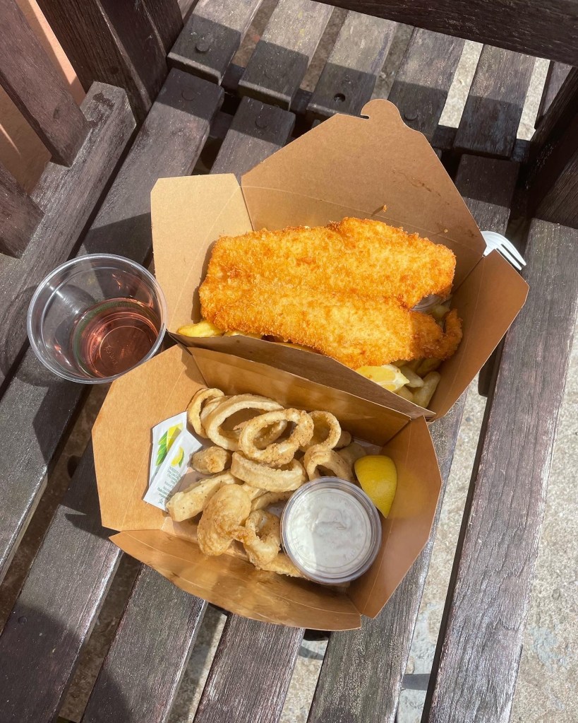 Back to harbor for delicious fish and chips and squid from a shack on the harbor wall.
