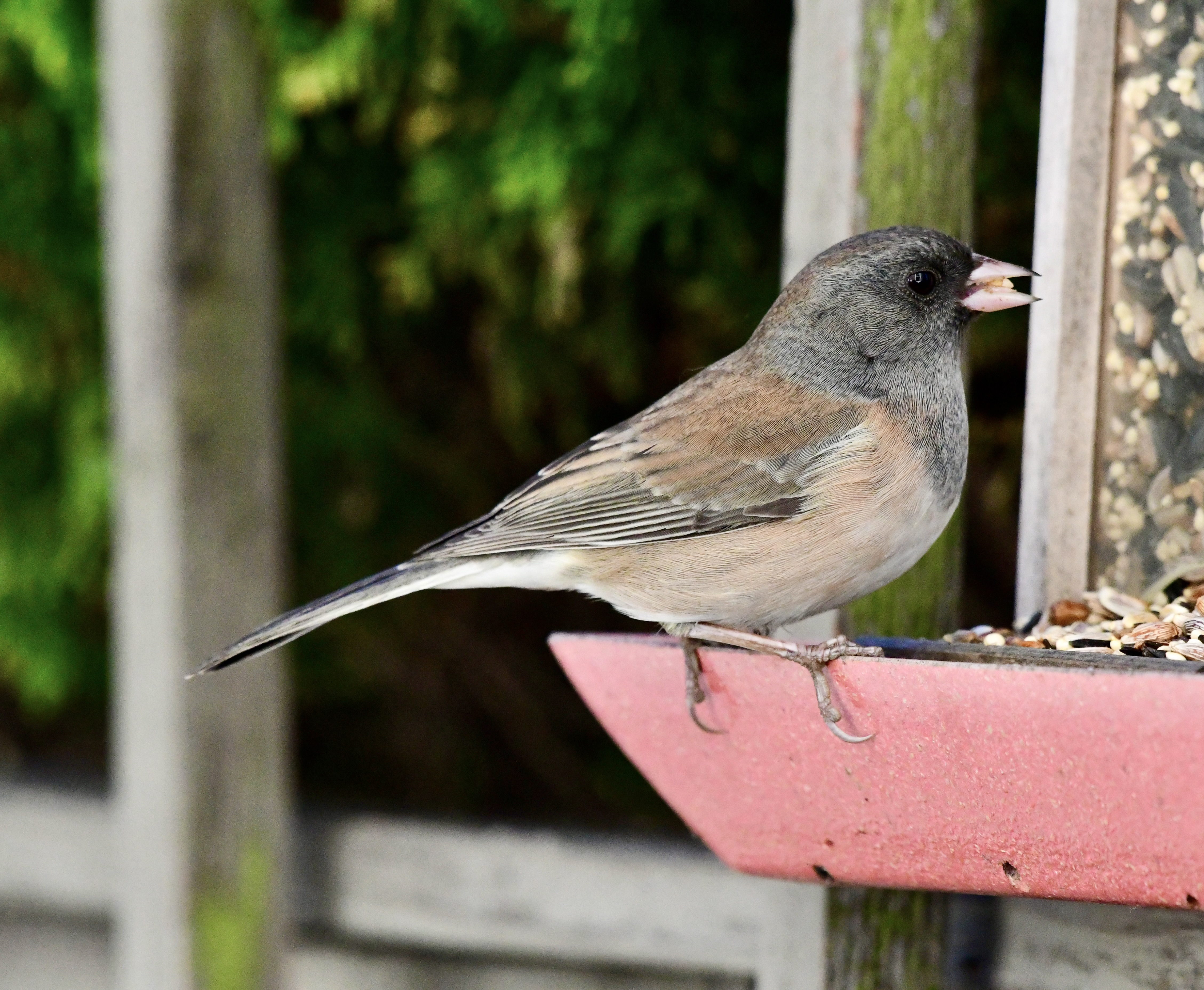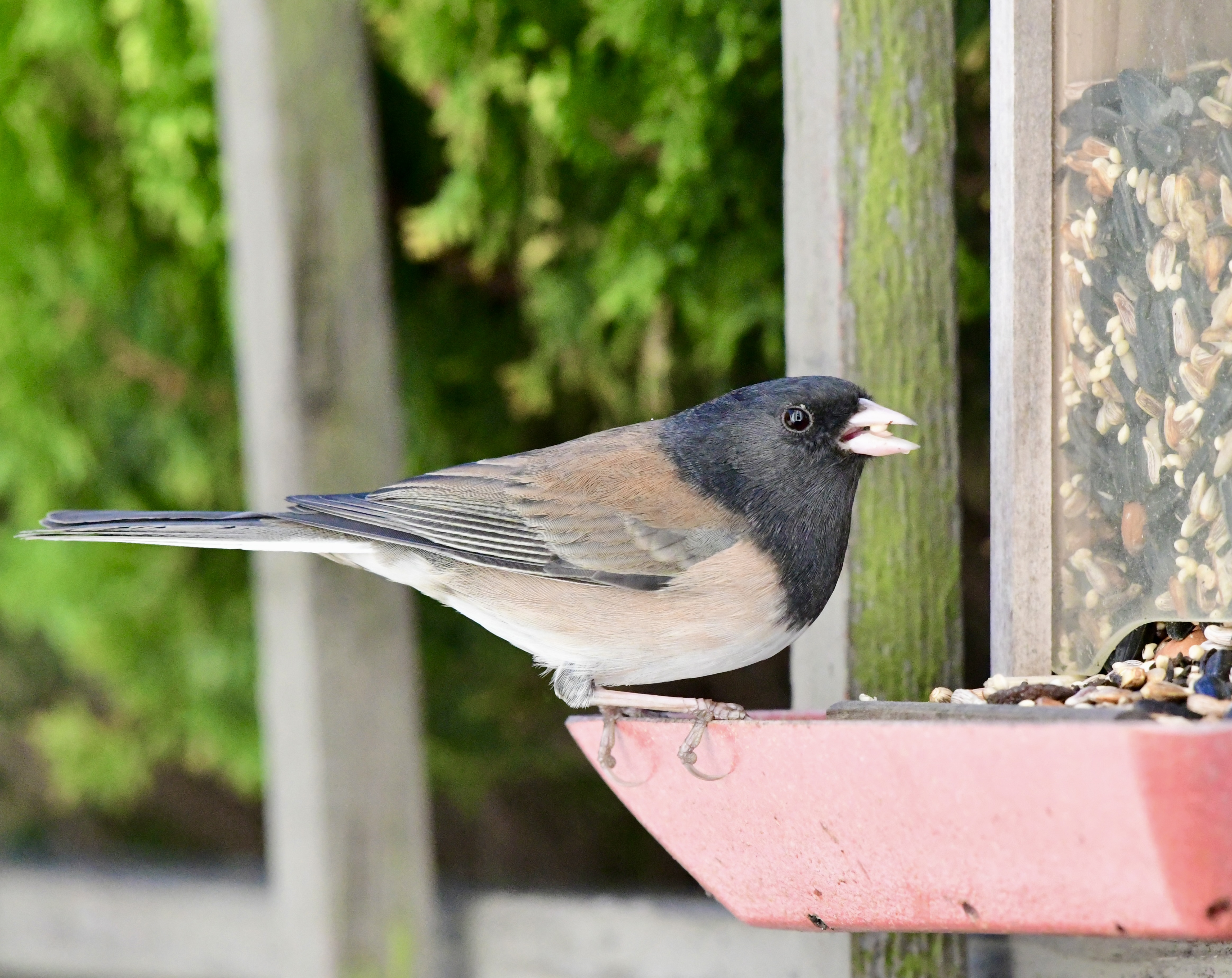 The feeder was up for about a week before any birds showed up. Then a male Oregon Junco shyly appeared and began to feed. Next day his wife comes too. Notice paler head.