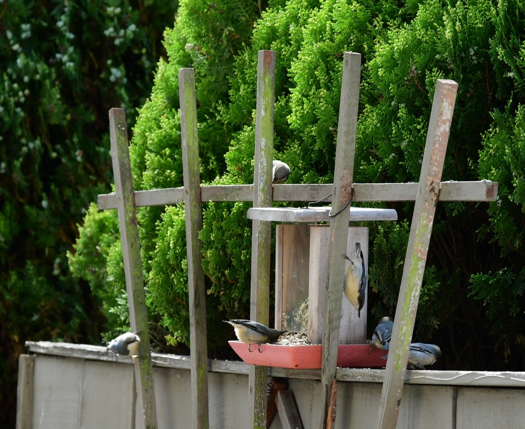 Within an hour, 8 of them completely take over. They chase off all the other birds fighting and squabbling incessantly. There cannot be many of these birds around here but within minutes the message of free food echoes around the Nuthatch population and they lay siege.