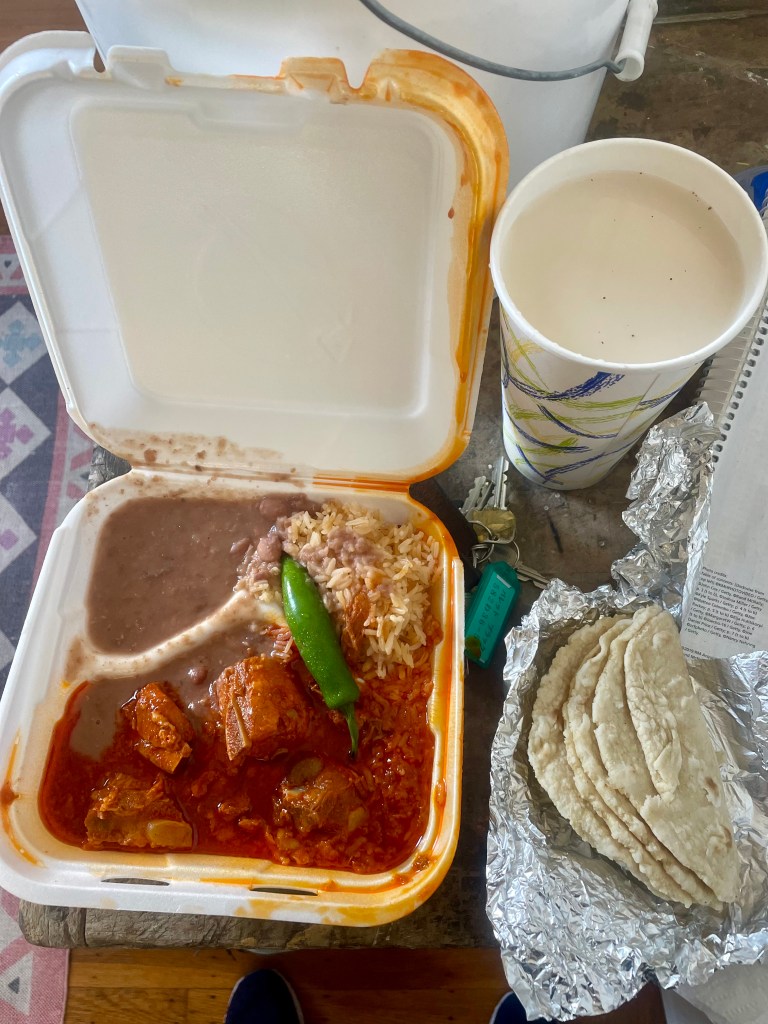 Homemade birria, beans, rice, tortillas and a pint of Horchata. Straight outside the front door!