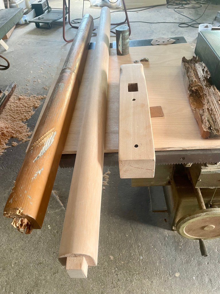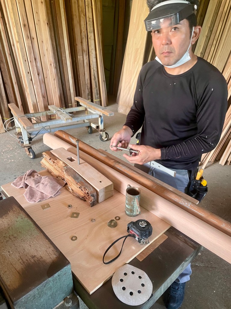 The tenon of the bowsprit has also rotted so I need a new bowsprit and sampson post. I try the supermarkets but they do not stock Norfolk Gypsy stuff really. I consult my carpenter friend, Tomo san, in Onna son. He is a great guy and has made me bits and pieces for the boat before. He reckons he can make a replacement and there is much discussion with his Dad as to what wood to use. The originals seemed to have been some sort of pine but we all agree that there is no way that pine will resist the rigors of the Okinawan climate. We go for a hardwood called Apitong that I have never heard of before.
