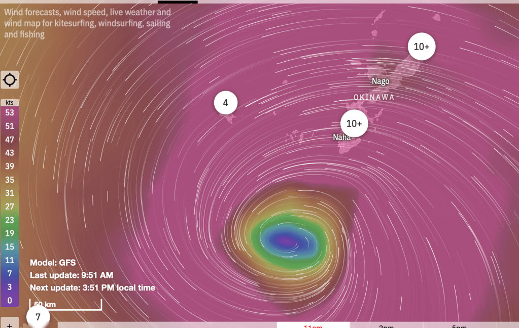 Not good news I’m afraid. A huge typhoon ripped through Okinawa yesterday. 100 knot winds for several hours and 1ft of rain!