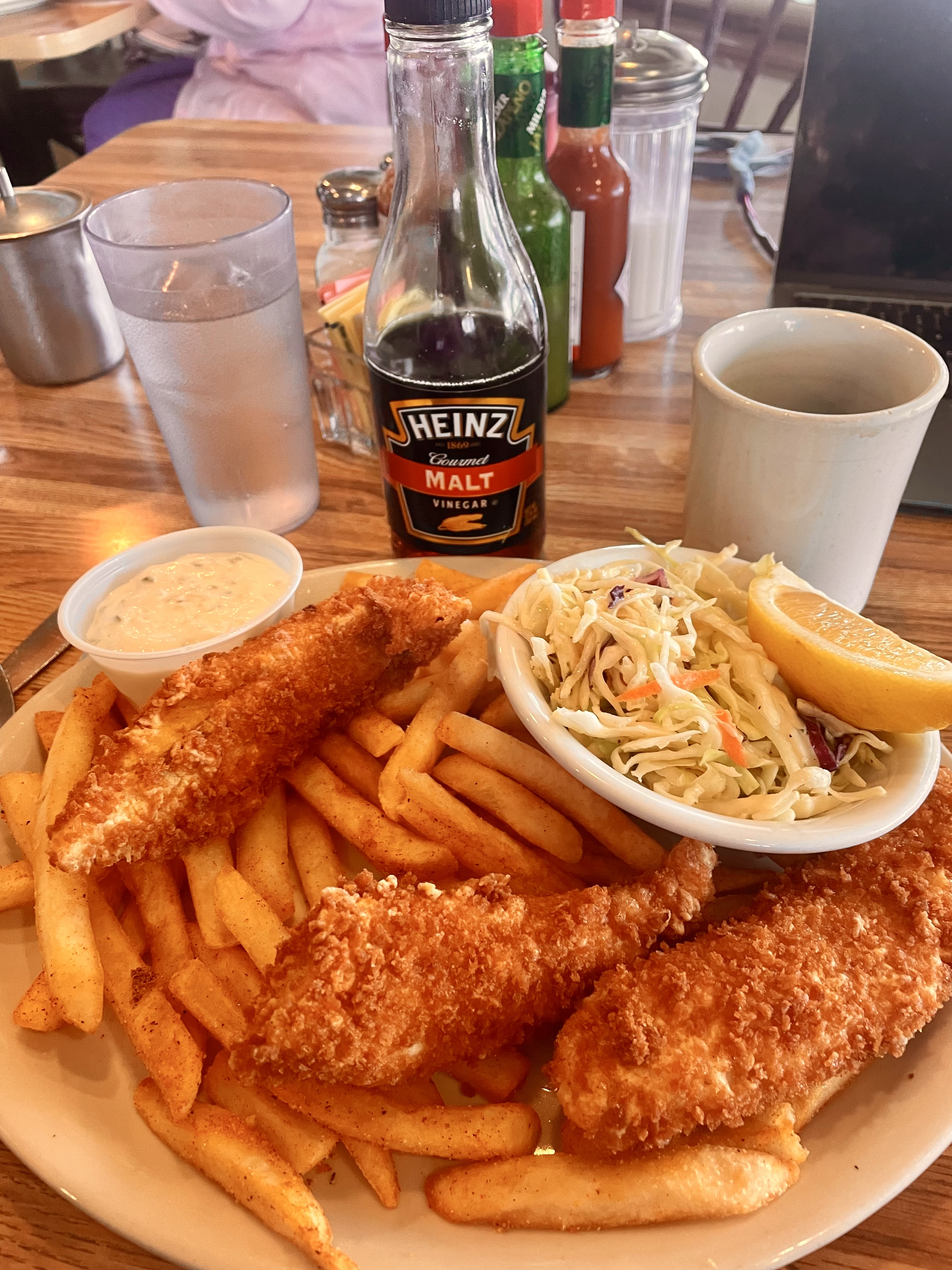 Unfortunately I wake up one morning with a grotesquely swollen face. At first I think this is a prelude to more major dental surgery but as time goes on I have no pain in my teeth just my jawbone and face. I now realise that a rattlesnake something similar must have slithered into the camper during the night to embrace my cheek. Anyway it is a huge drag as I both feel and look monstrous. It is even difficult to open my mouth sufficiently to gobble fish and chips.