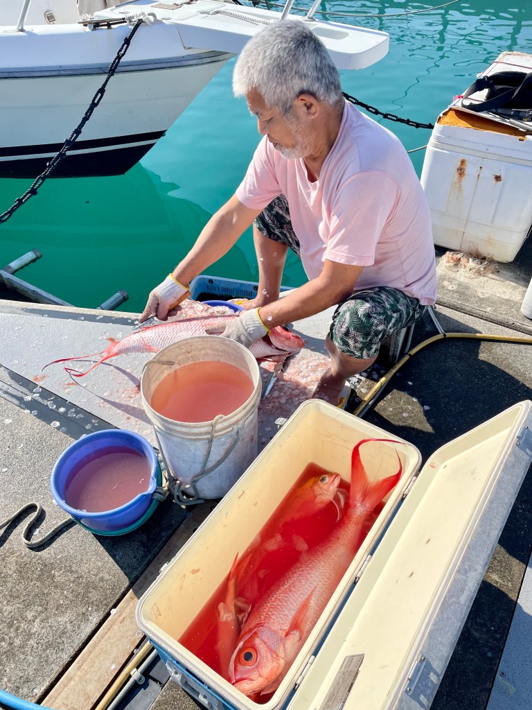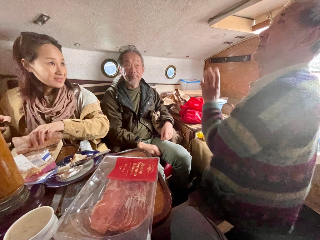 Suddenly the weather gets much worse! High wind and driving rain. We scuttle into the cabin and keep eating.