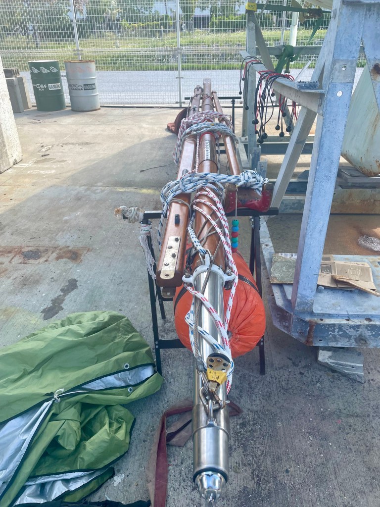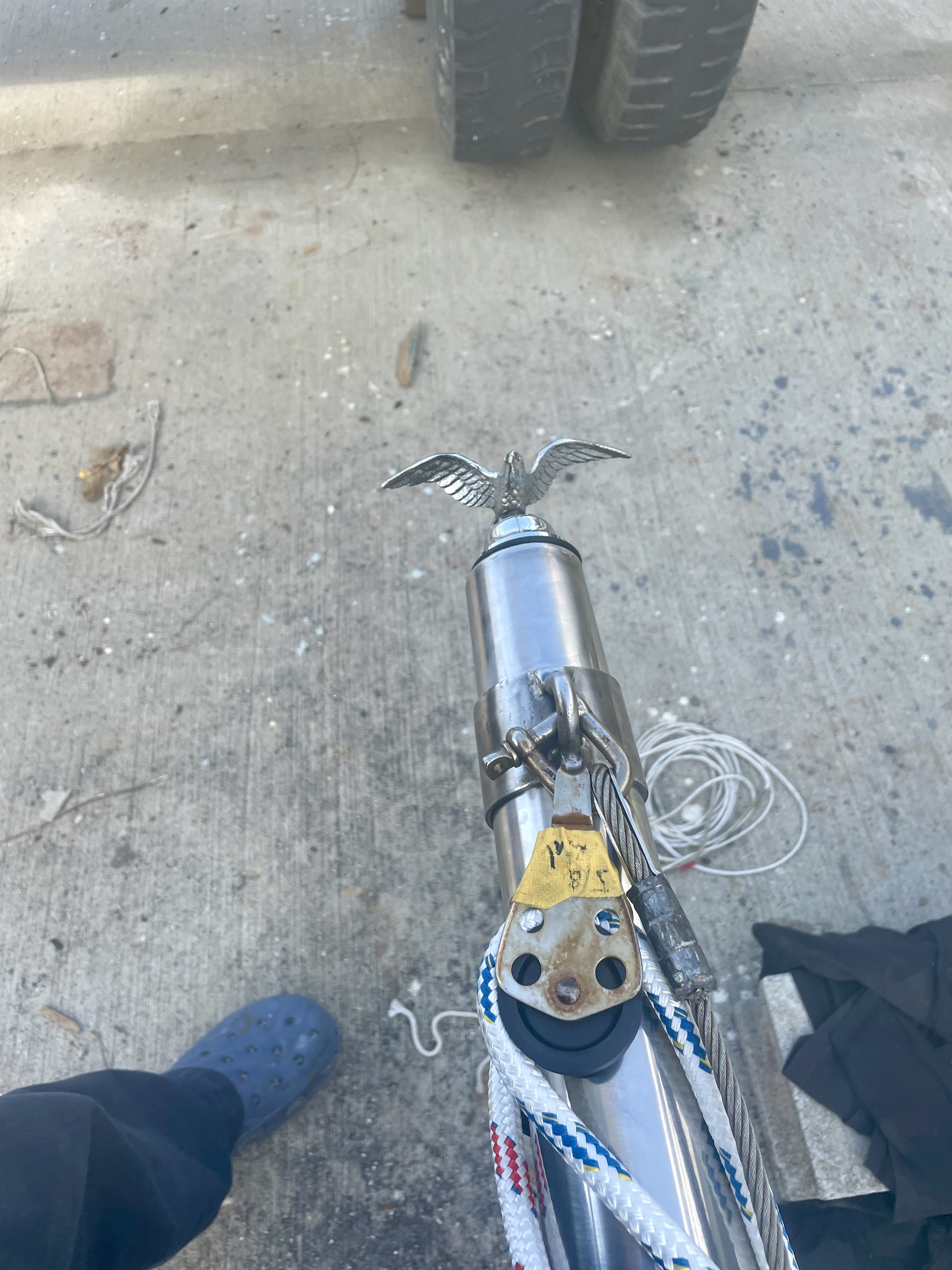 Kiyuna san has been at his eccentric best over the last week or so. He talks to me seriously about the necessity of having an eagle on the boat. His argument is that bad weather at sea is caused by dragons and that an eagle would drive away the dragons thus ensuring smooth sailing for my little boat. I think he sort of believes this. Anyway, a couple of days later I go down to the marina to attach the last halyards and find an eagle on top of the mast!