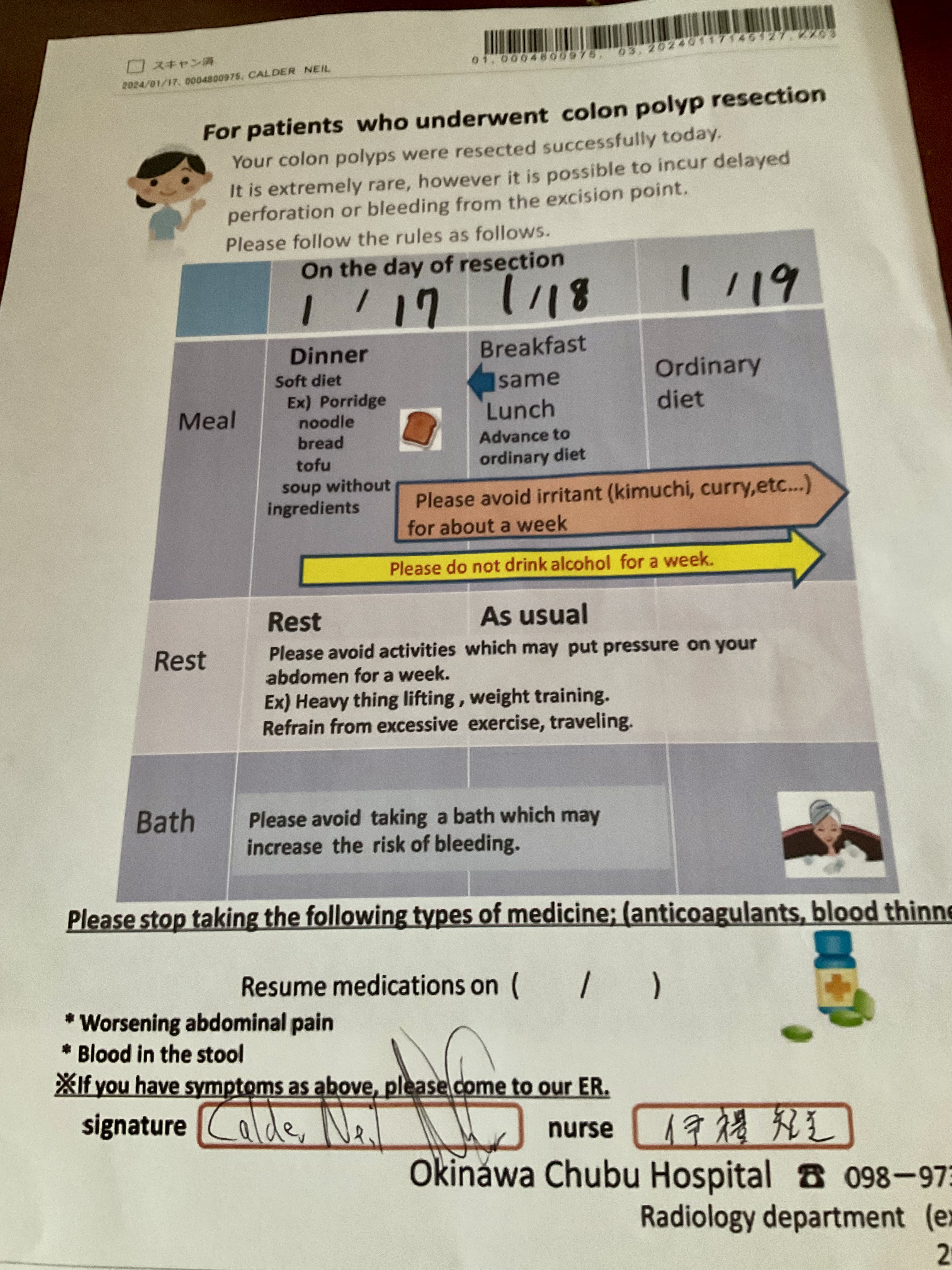 Post op instructions, amazingly in English. No drink for a week! Hmmmm.