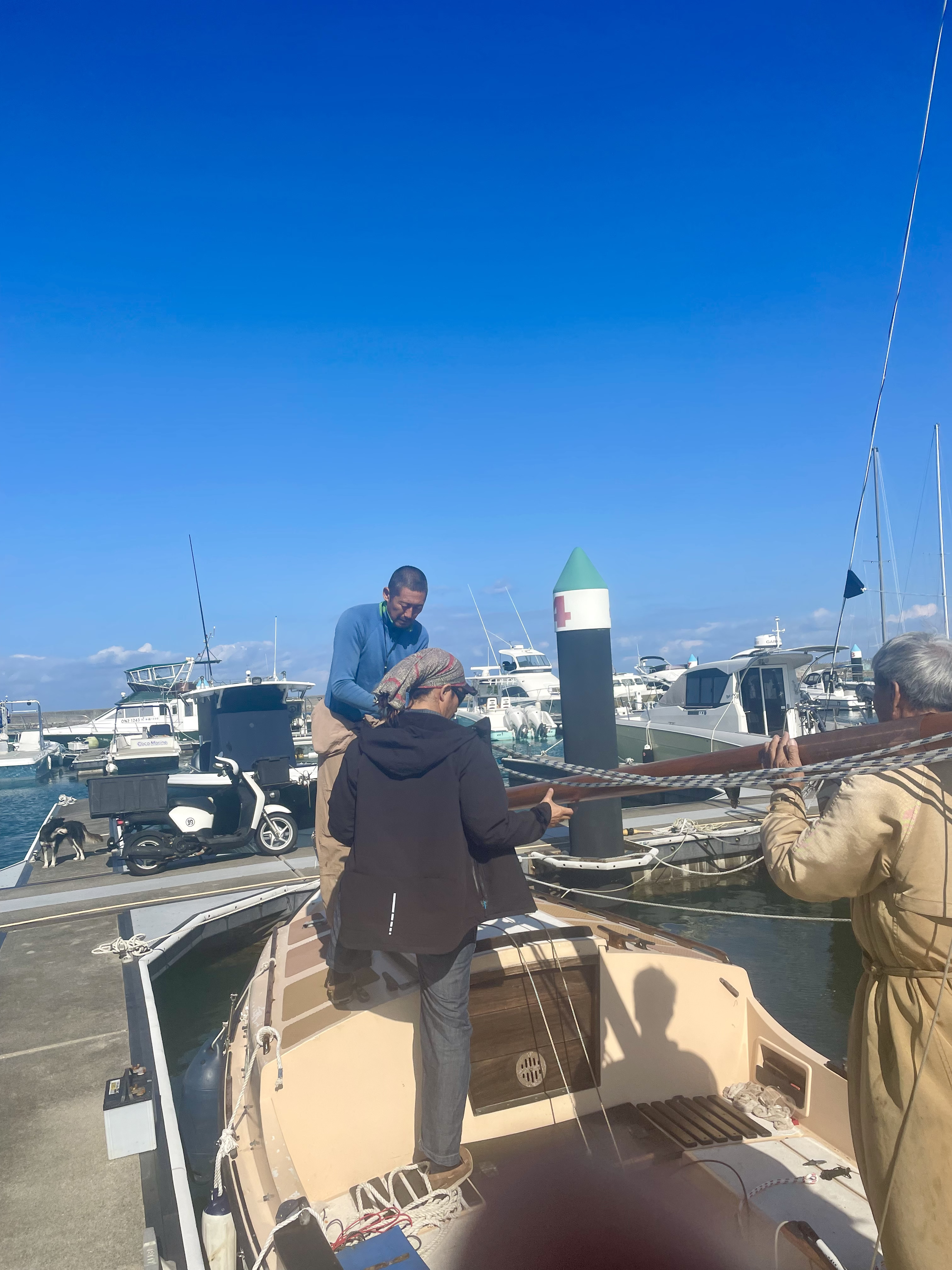 We were just strolling along with a not heavy mast but I have done myself damage. “Dai jo bu, Neil san I will call Wantanabe san.” 5 mins later he turns up – he is another wonderful Okinawan boat personality. He lived out of a van for 7 years but last year graduated to a live-in boat that is moored in the Itoman Fishing Port. He is currently restoring a beautiful 40ft ketch which went down in the same typhoon that did so much harm to my boat. Kiyuna san refers to it as ‘The Underwater Boat.’