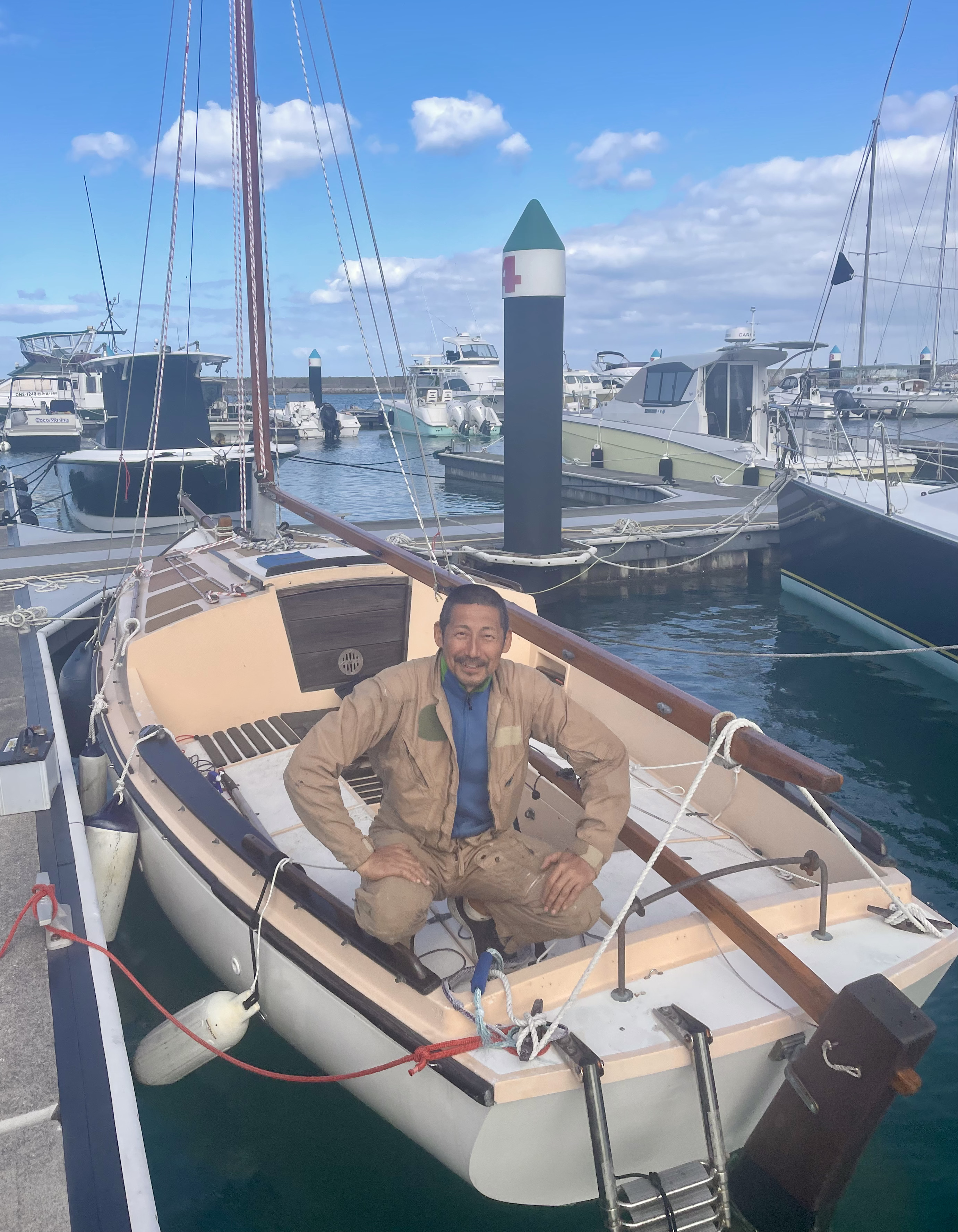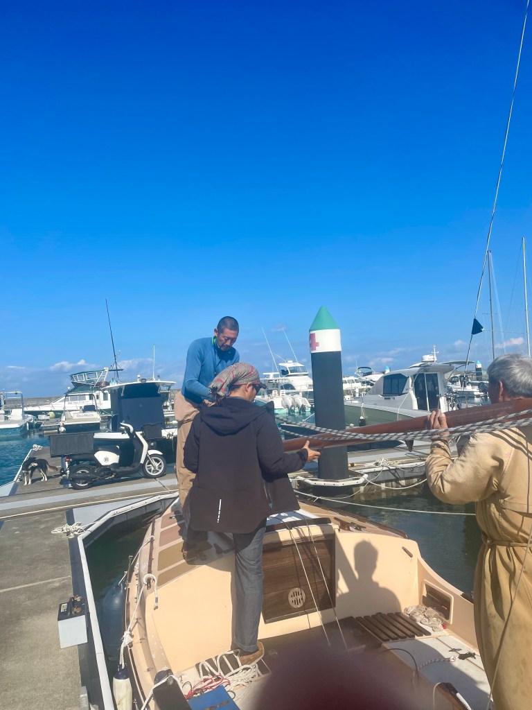 Wantanabe san tests out the throat and peak halyards. He is delighted as he has never experienced a gaff rig before.