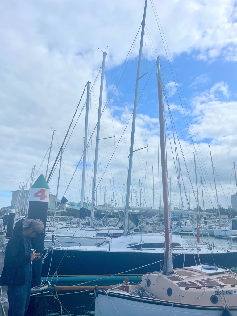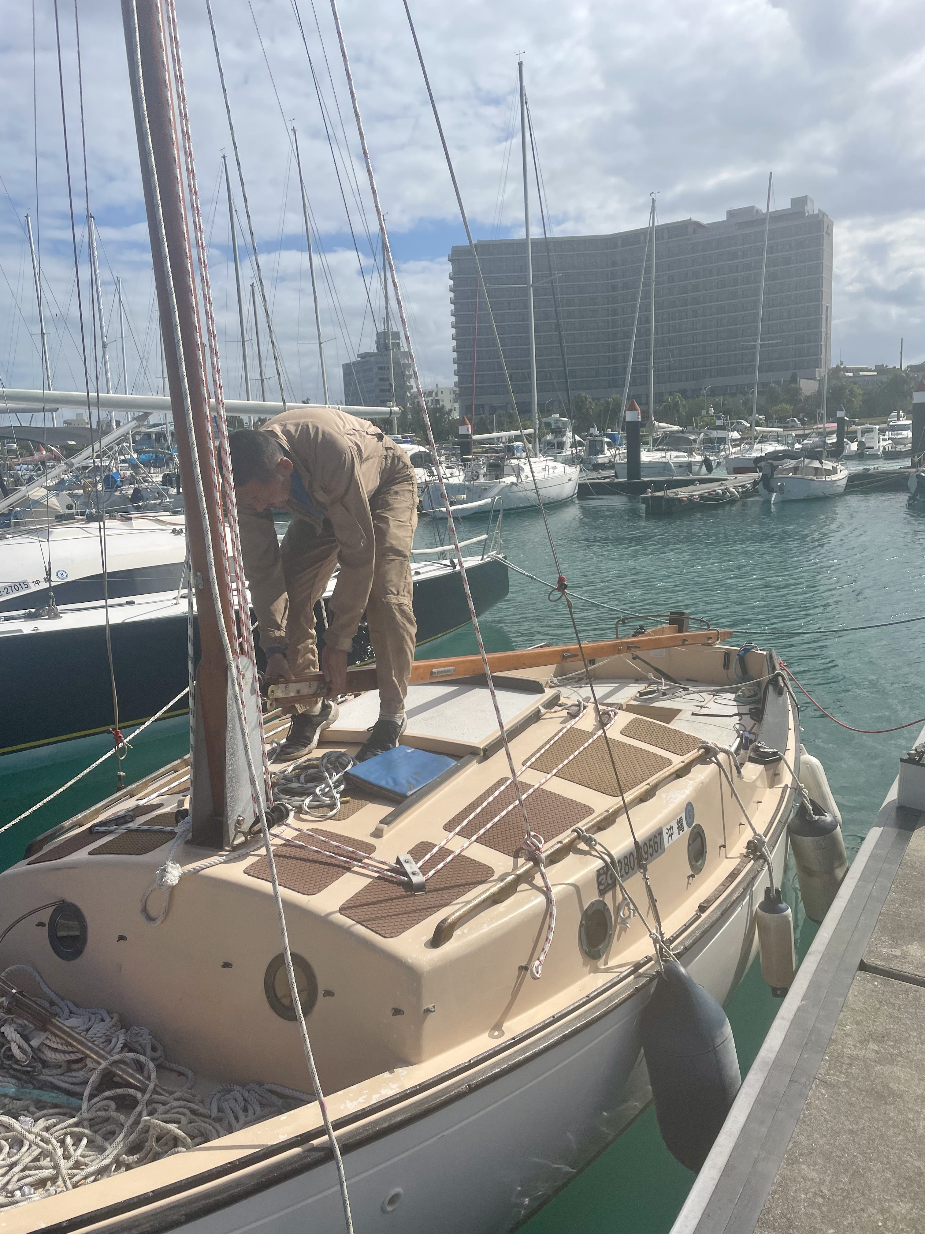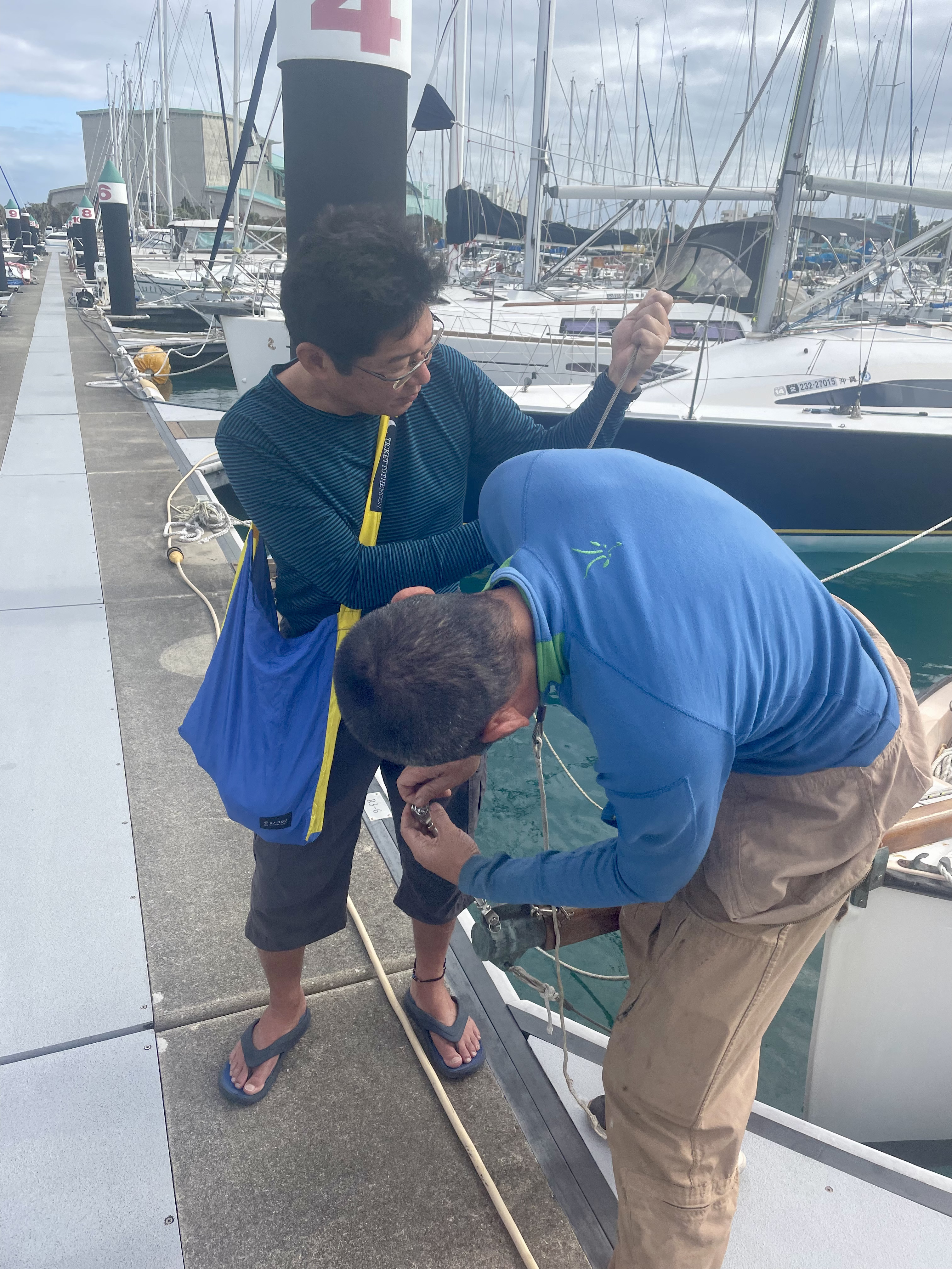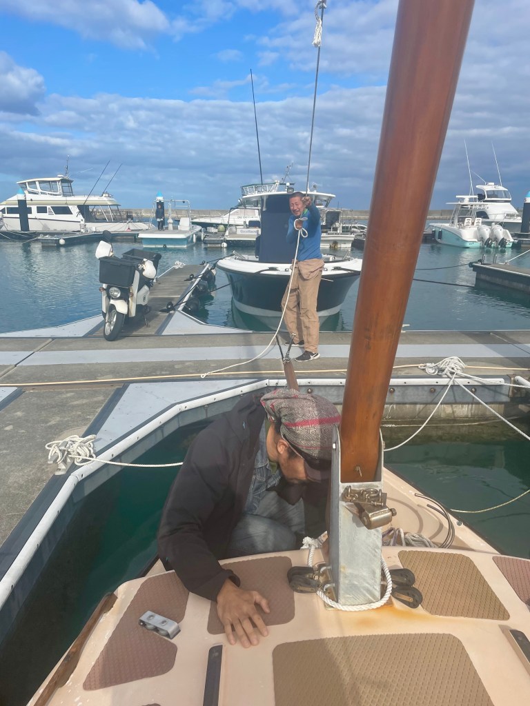 We hit a road block. The eye splice on one of the halyards makes the rope thicker and it will not go through an essential block. We need a bigger block. I am all set to go down to Island Boat https://www.island-boat.com/index.php to buy a bigger and probably very expensive block. My friends have other ideas and wander around various boats looking to pirate a suitable block. I am not sure what is going on but I think one or the other was working on these boat and borrowing seemed quite in order. Wantanabe san finds the perfect block!