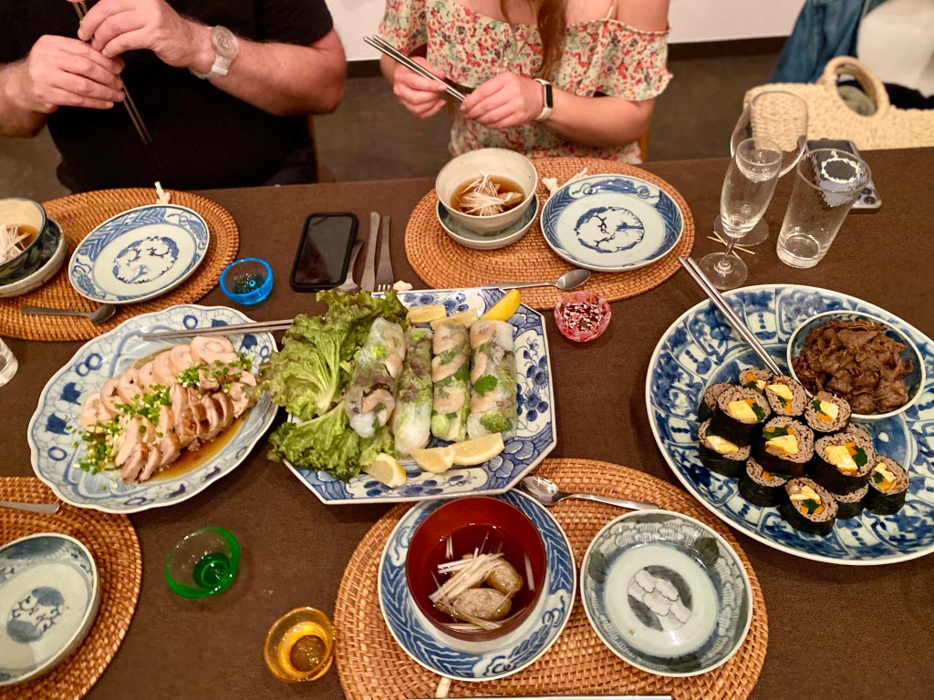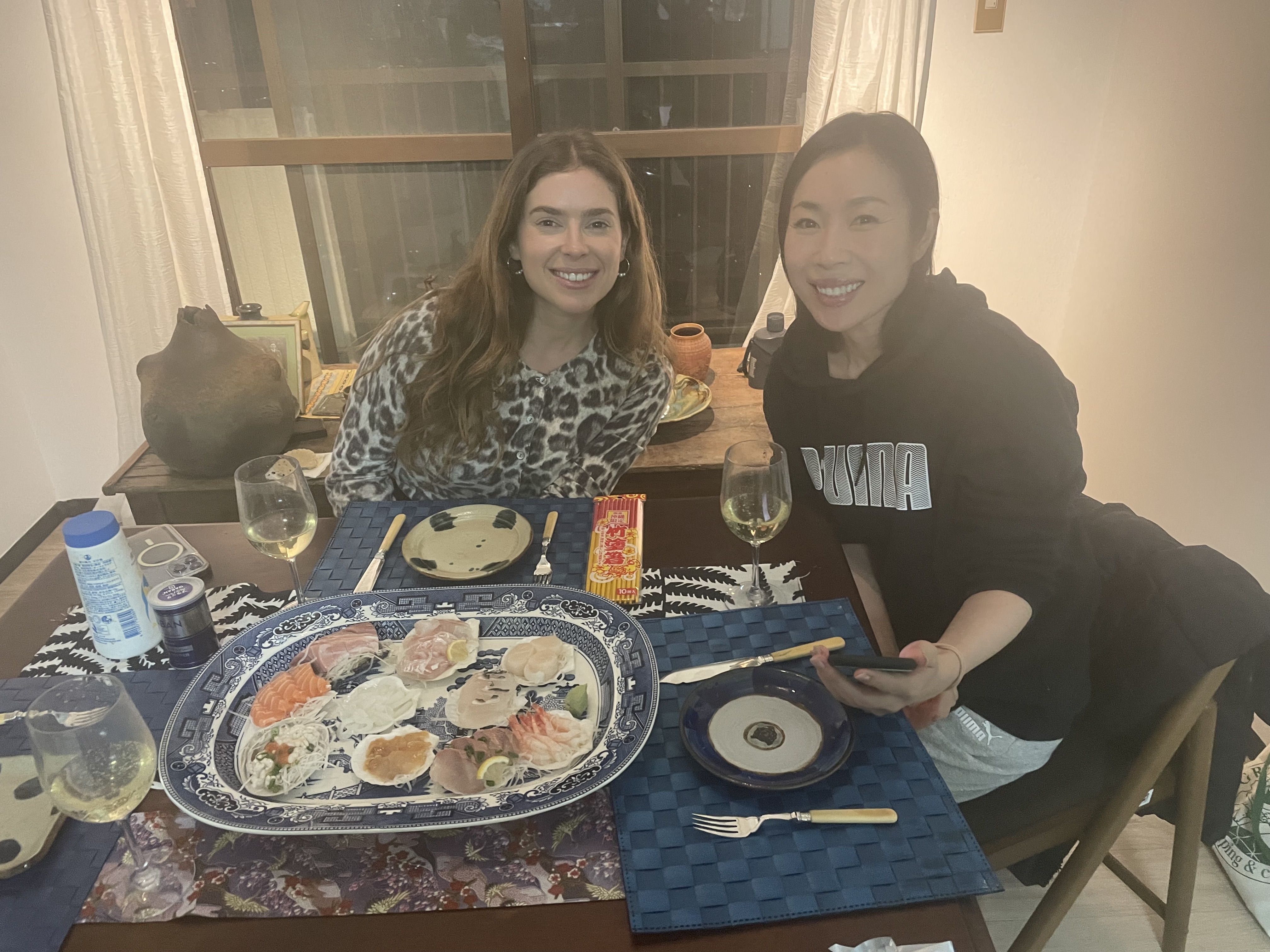 We also eat lamb chops and Mentaiko Salmon and drink lots of good wine. Suddenly it is one a clock in the morning! I rarely make it past 10:00!